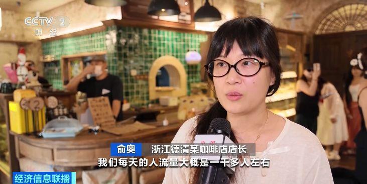 浙江德清某咖啡店店长俞奥:国庆假期期间,我们每天的人流量是一千多人,比平时的话会多30%到40%,营业额会比平时多20%到30%。