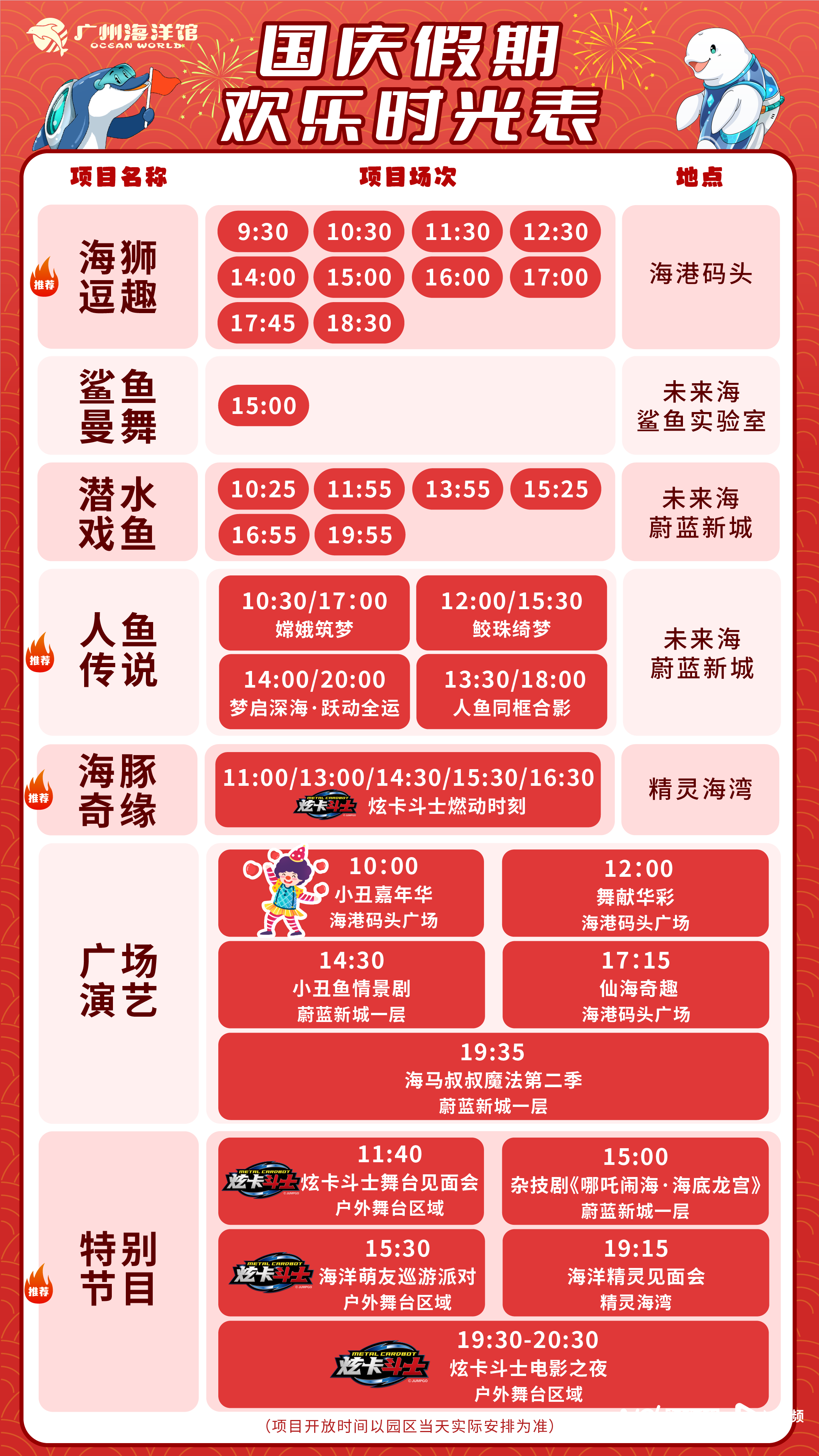 国庆中秋假期,广州海洋馆从早上9点营业至晚上9点,结合全运主题和海洋特色推出“海洋动物全运会”、美人鱼演艺《嫦娥筑梦》、人气动画IP炫卡斗士见面会等30多场精彩日夜游活动,联动广州杂技团打造沉浸式海底剧目《哪吒闹海·海底龙宫》,国庆当天携手广州市文化馆举办“歌唱我的祖国”音乐会,全网超5000万曝光的人气NPC“小丑冰冰”与游客亲密互动,精彩纷呈的文旅活动受到市民游客的热烈欢迎和喜爱,为广州双节文旅消费市场注入活力。