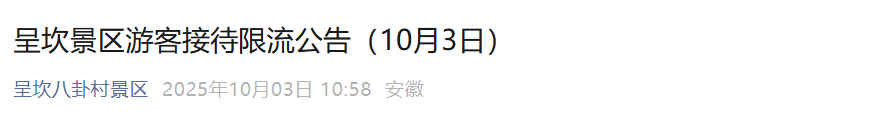 截至今日(10月3日)上午11:00,呈坎景区游客接待量已达饱和。为确保游客安全和体验品质,现温馨提示: