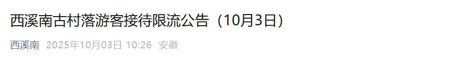 截至今日(10月3日)上午10:30,西溪南古村落游客接待量已达饱和。为确保游客安全和体验品质,现温馨提示:
