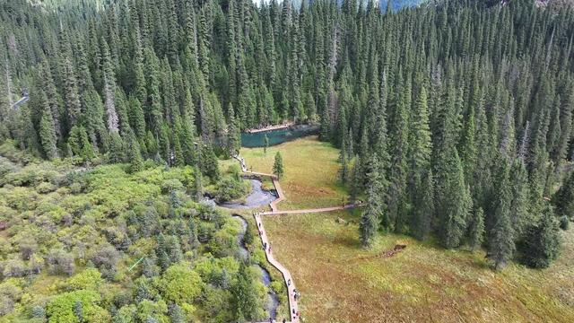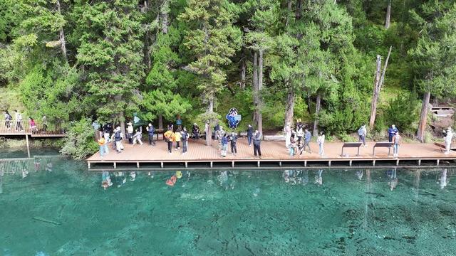 初秋的阳光穿透岷山深处的千年林海,远处高山在晴空下熠熠生辉,原始森林与碧蓝海子构成的秘境画卷,游客们首先被眼前壮丽的自然风光所震撼,纷纷举起相机,定格下林海与海子交织的壮阔全景。阳光洒在林间,光影斑驳,清澈的海子倒映着蓝天白云与四周的翠绿,空气中弥漫着杉树与泥土的清新气息。