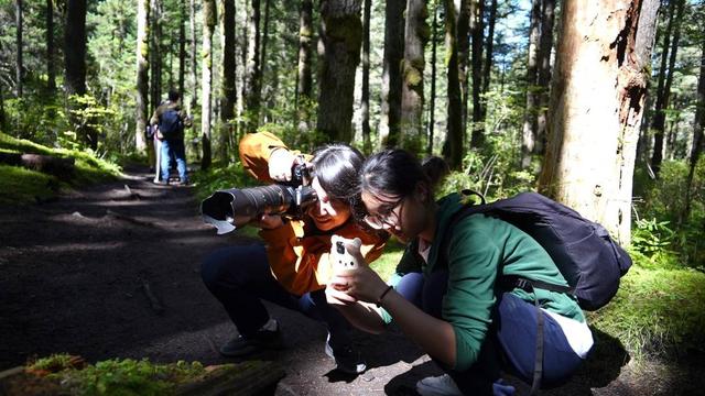 在开阔的冷杉林间,徒步的游客们放慢了脚步。阳光透过枝叶洒下,形成一道道光柱,成了绝佳的拍摄背景。人们或与巨大的冷杉合影,或专注地拍摄林间的苔藓与菌类,用镜头捕捉着原始森林的每一处细节之美。家长们也带着孩子,蹲在地上一起观察林间的植物,从这些痕迹中探寻、了解大熊猫的家园。