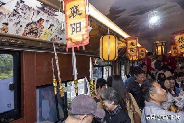 走上公交车的那一刻,仿佛瞬间穿越到了金庸笔下的武侠世界。原本冰冷的金属车厢,被精心改造成了古色古香的 “江湖驿站”:车顶悬挂着数十盏绢花灯,暖黄色的灯光透过薄纱洒下,给整个车厢蒙上了一层温柔的光晕;两侧车窗被换成了雕花木窗,窗棂上刻着 “侠”“义” 二字,微风从窗缝里钻进来,带着淡淡的桂花香;车厢内壁挂满了绣着门派标识的挂旗,“丐帮”“桃花岛” 的旗帜在风中轻轻飘动,角落处还摆放着一面牛皮战鼓,鼓面上 “襄阳保卫战” 的图案格外醒目;座椅被全部拆除,取而代之的是铺着红色毛毡的长凳,游客们可以随意坐下,与身边的 “江湖人士” 畅谈。