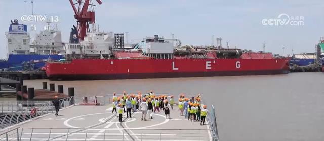 跟随观光车,研学师生们踏上了江南造船的码头。伴随着生产现场机器的轰鸣声,在巨型龙门吊下,正在船坞内紧张建造的大型集装箱船、液化气运输船呈现眼前。从一块钢板的切割、成型,到万吨巨轮的合拢、下水,给大家带来沉浸式的“硬核”体验。
