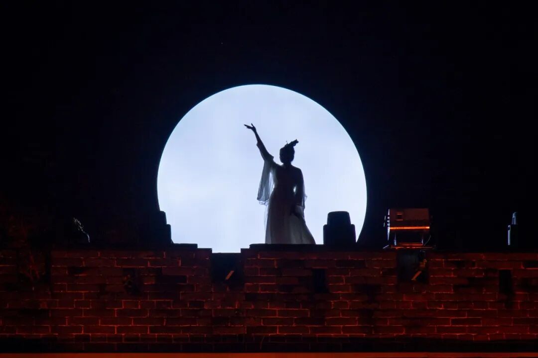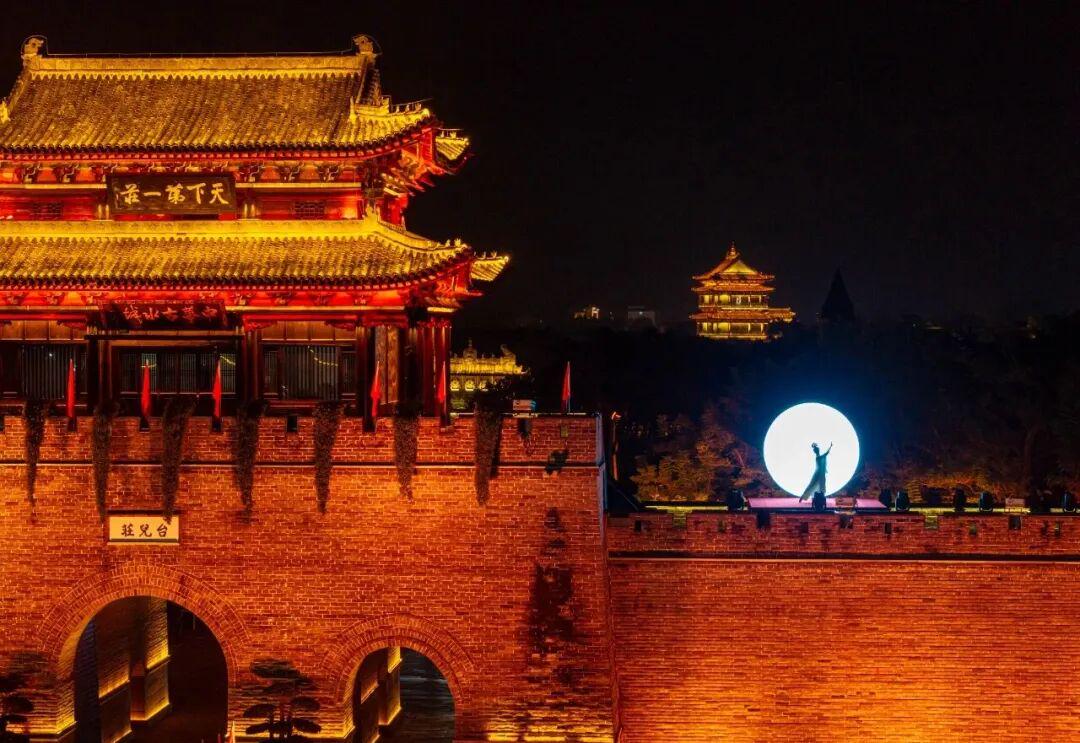 西城门之上,一轮真月在天,一轮幻月依墙。舞者翩然于双月之间,衣袂当风,影姿绰约。她们以城楼为舞台,以苍穹为幕布,将古老中秋的神话与浪漫,演绎成一场可触可感的飞天梦境。