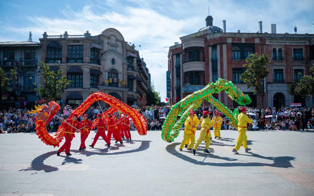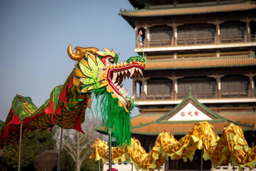 铿锵的鼓点骤然划破天空,如惊雷般唤醒沉睡的激情。舞者手持彩槌,以刚健的舞步击响盛世节拍,鼓声雄浑,气势磅礴。金龙随之起舞,在震天的锣鼓声中翻腾飞跃,将千年的祈愿与当下的豪情融为一体,舞出太平盛世的昂扬气象。