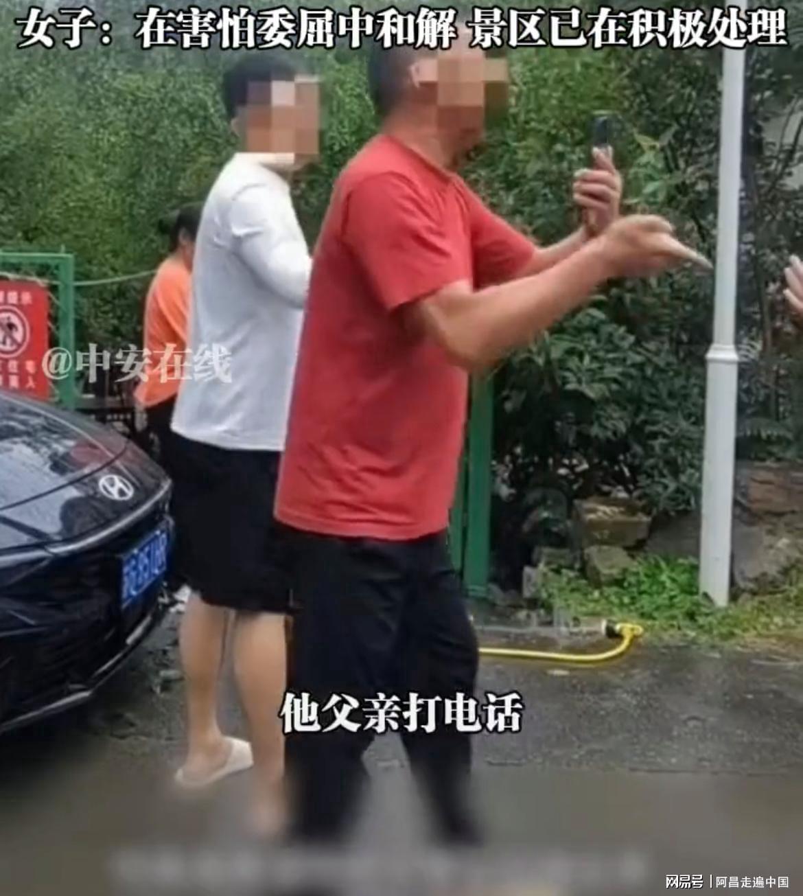 这时民宿老板娘她在景区上班的父亲冲上来,也开始拍视频,他父亲打电话叫来了景区的工作人员来查票,在争吵的期间,老板娘用手肘攻击我弟弟,老板娘声称自己已经怀孕两个月,已经见红了要流产,老板先提出了两千元的赔偿,调节后变成了300块钱的营养费,我们已经赔偿对方了,我们家人就再害怕跟委屈中同意了和解。