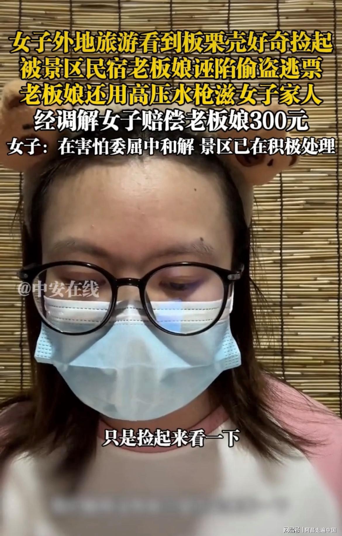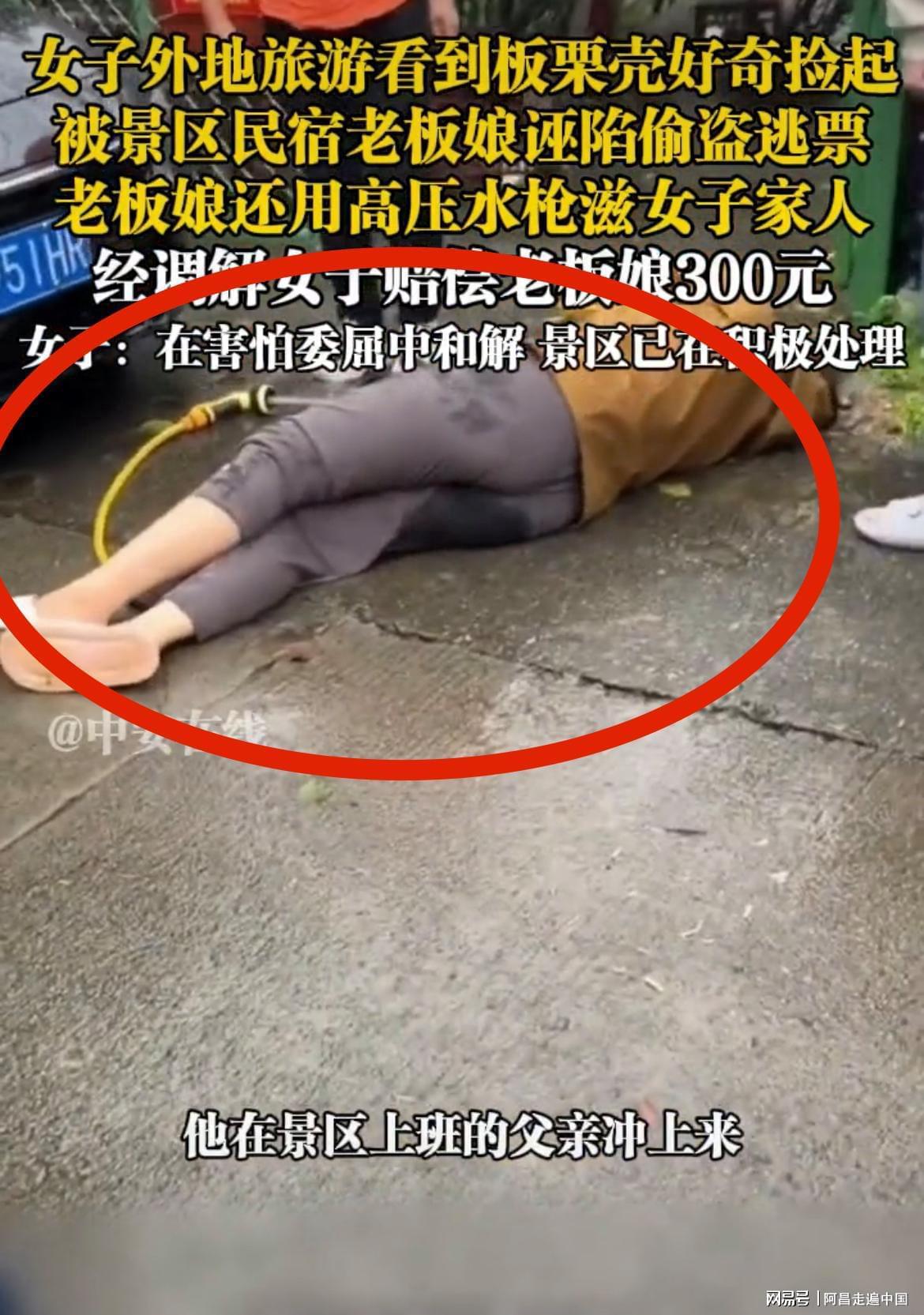 我们解释没有偷,只是捡起来看一下,我们也并没有偷,民宿老板娘要报警处理,说我们是小偷,说我们是逃票的,我妈拿起手机开始拍摄对方,老板娘用洗车的高压水枪对着我妈和外婆的脸开始兹,我妈上去推他手臂,问他干什么,他顺势倒下打滚。
