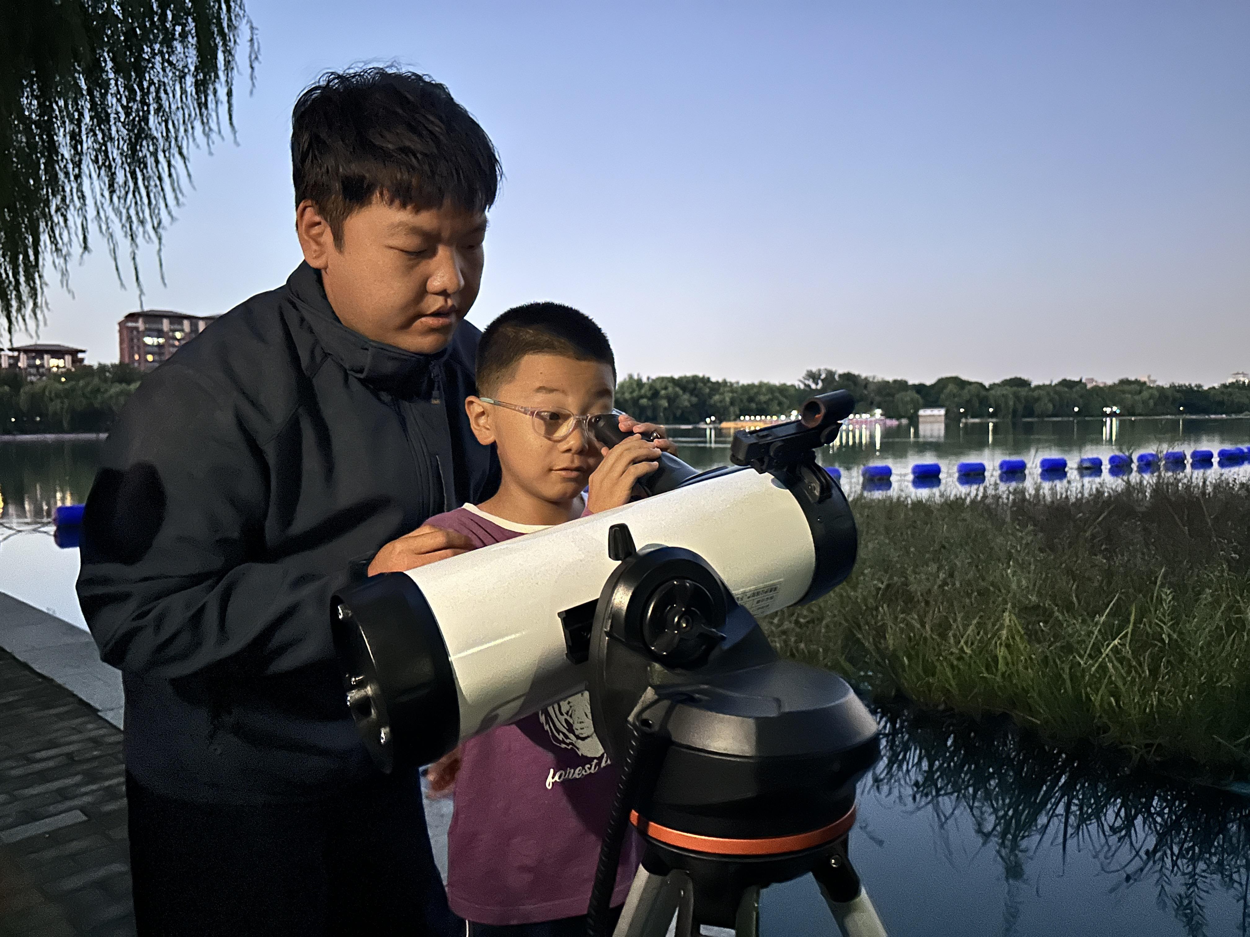游客用天文望远镜观赏月亮。玉渊潭公园供图