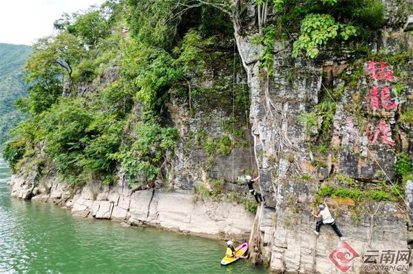 在大理白族自治州南涧彝族自治县公郎镇澜沧江猛龙渡旅游景区,游客体验“攀岩”运动。