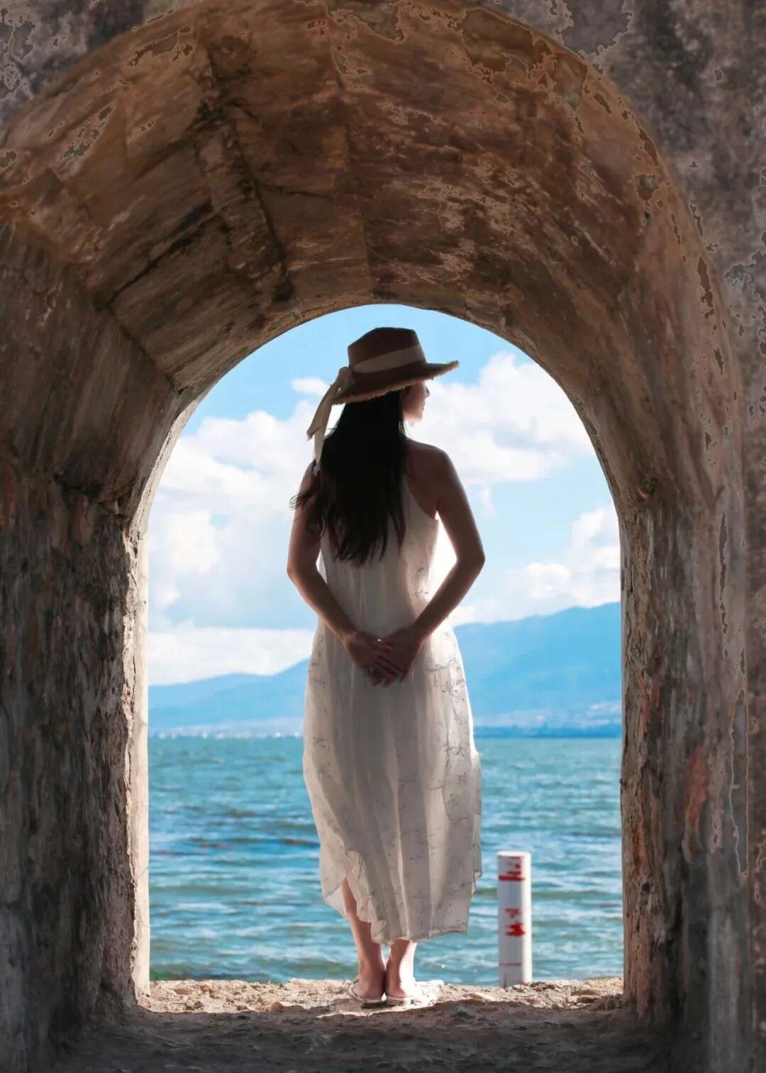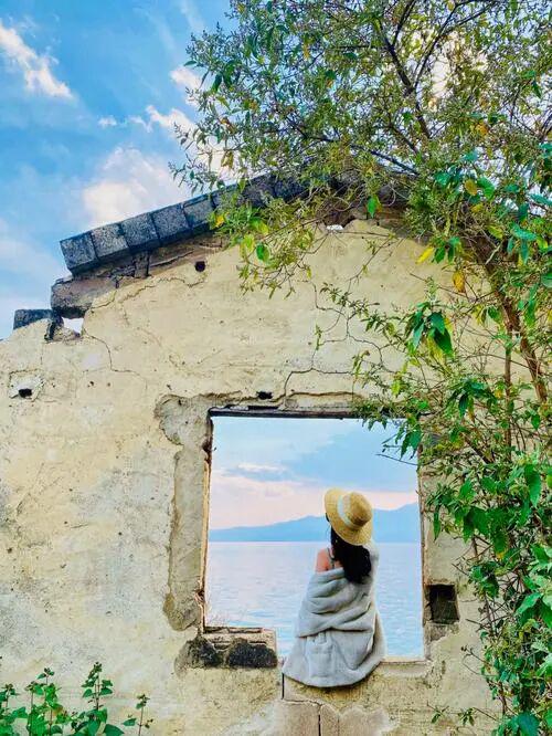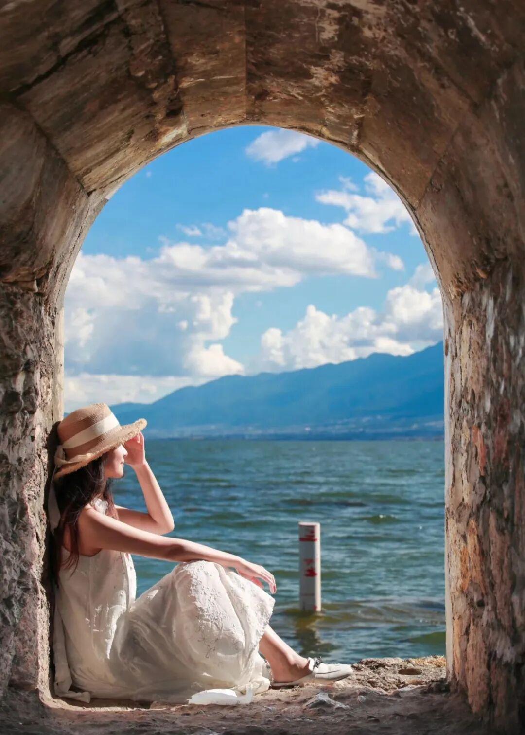 废旧石窗:悬崖边的废弃房屋窗户框住洱海全景,穿浅色系衣服站在石台上,随手拍ins风大片。