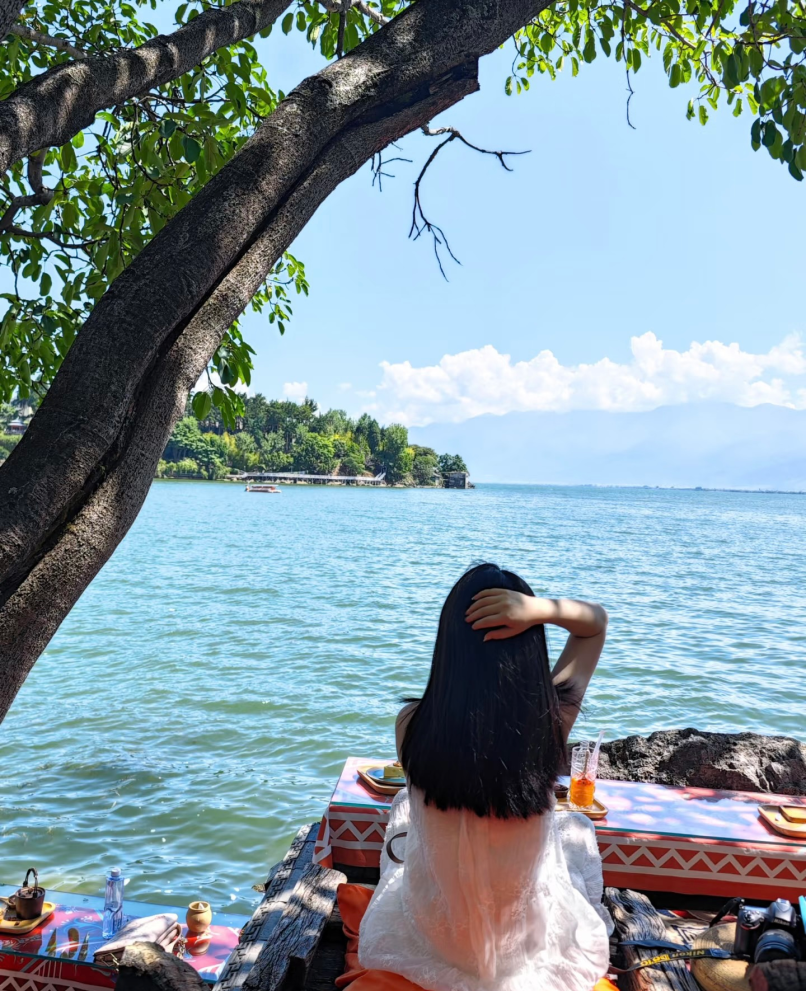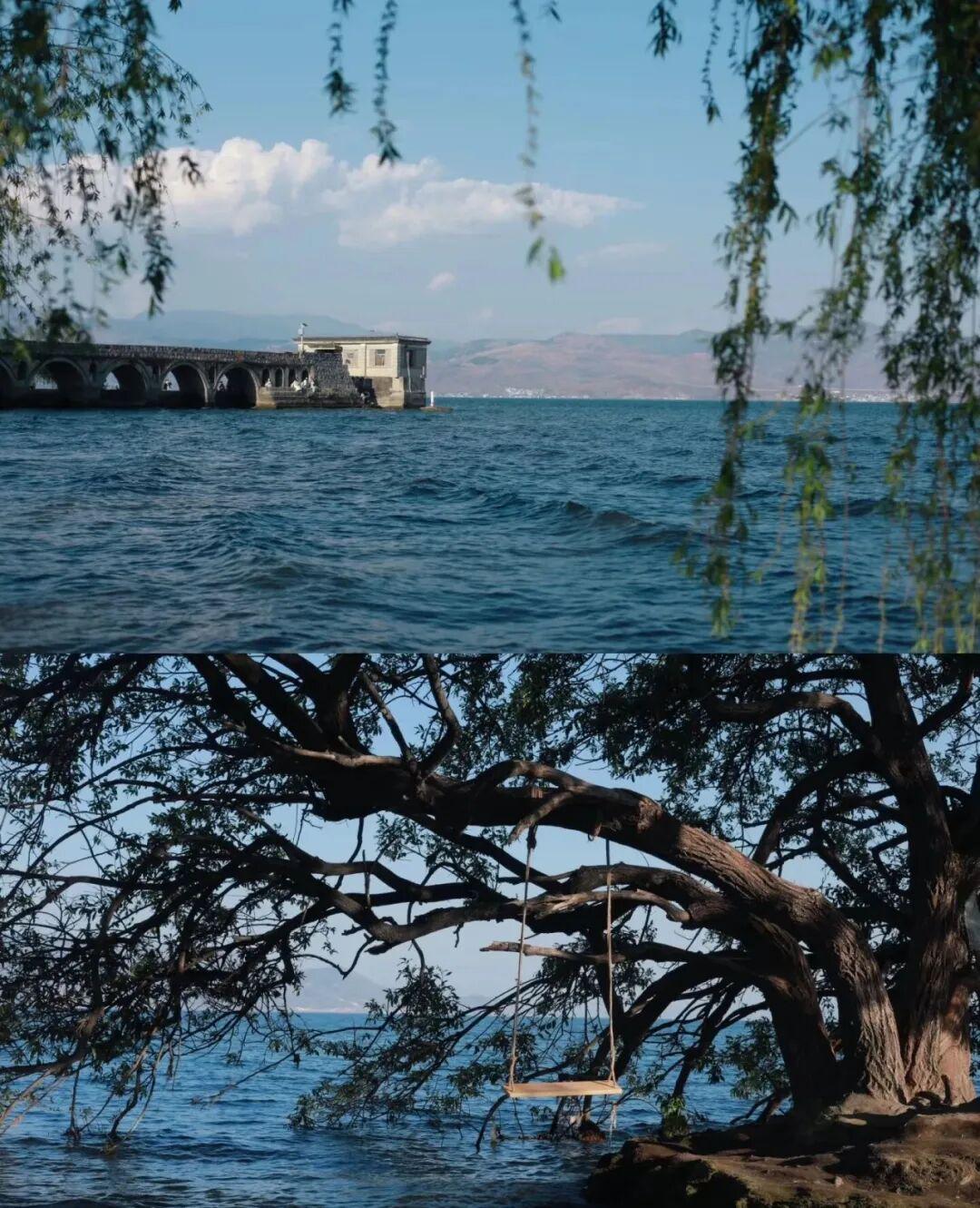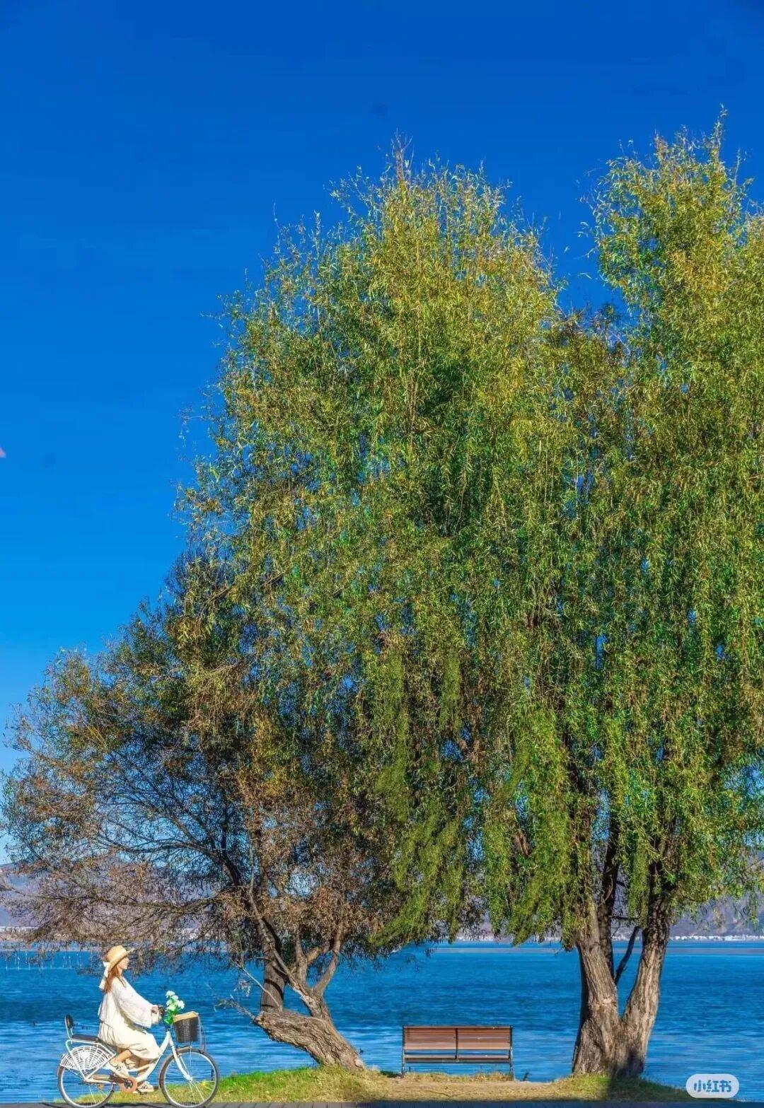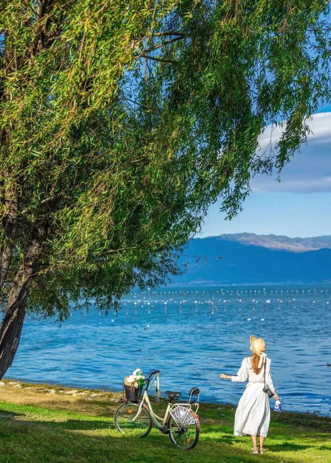 孤独树:老柳树斜倚湖边,背景是苍山洱海,穿白裙或浅色长裙,风扬起裙摆时秒变“宫崎骏女主”。