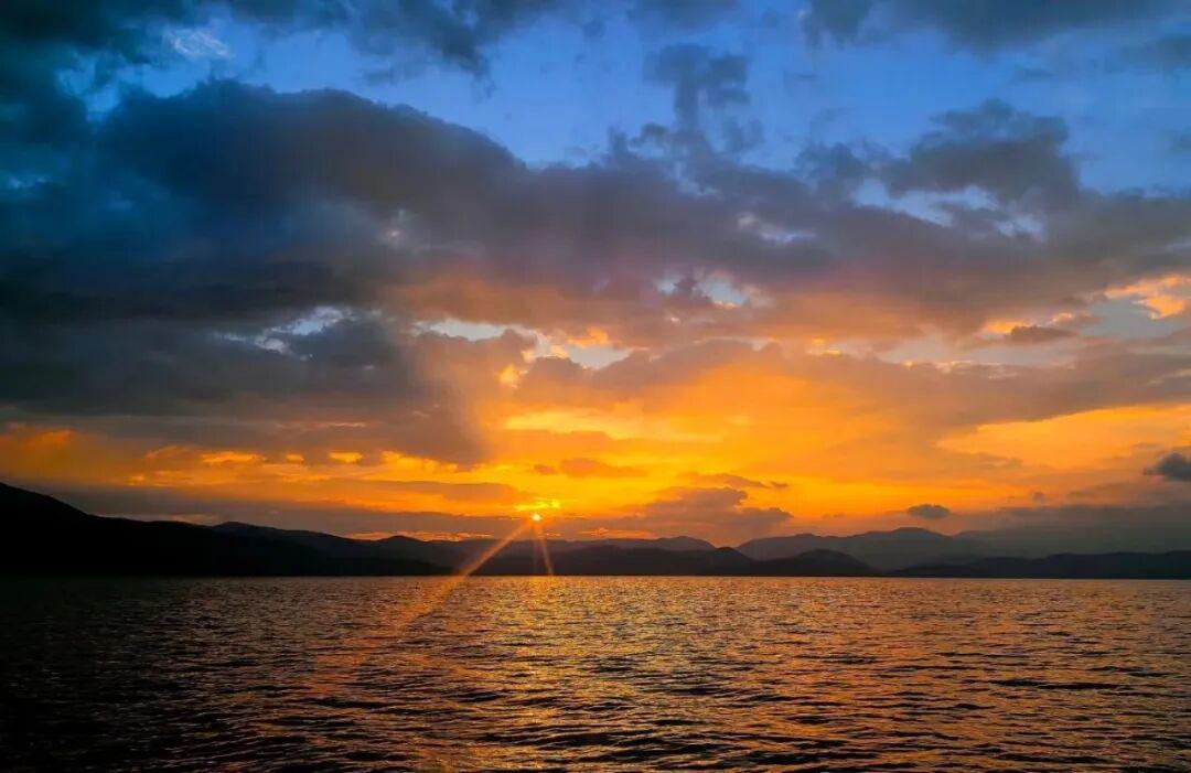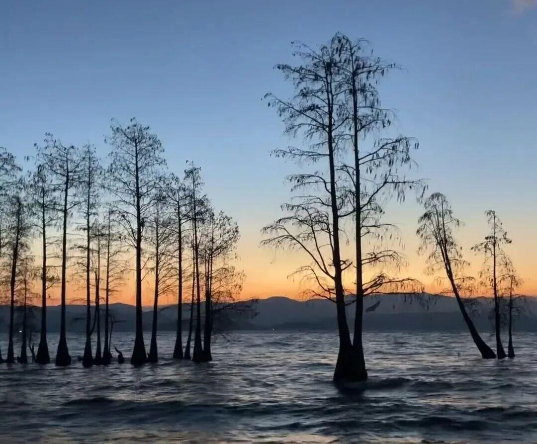 亮点:洱海日出C位!朝阳从云层缝隙洒下,湖面碎金闪烁,红杉树倒映水中,宛如“橘子海”。