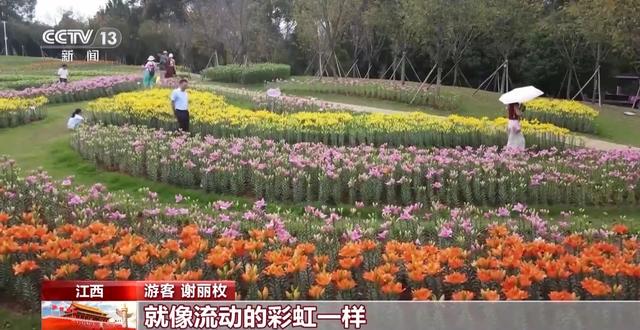 游客 谢丽枚:站在高处往下看,花浪跟着山势走,就像流动的彩虹一样,特别特别美。