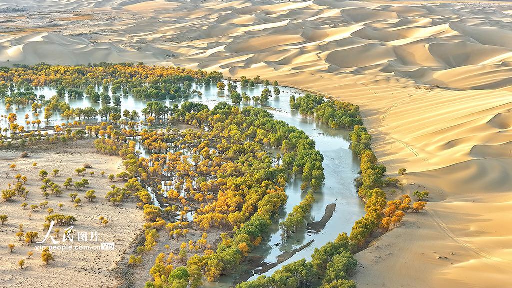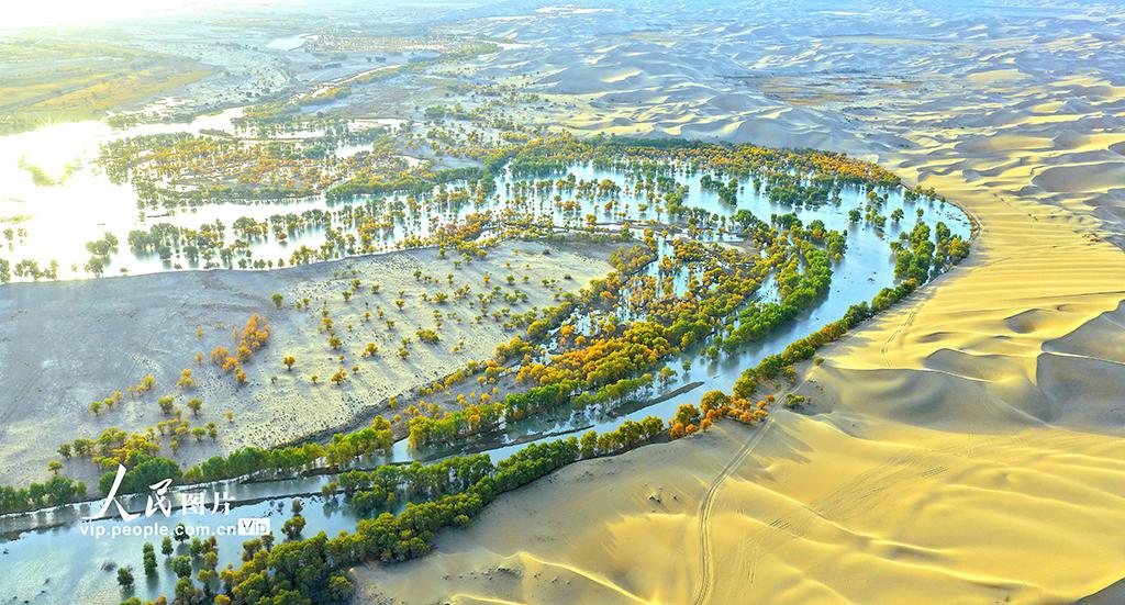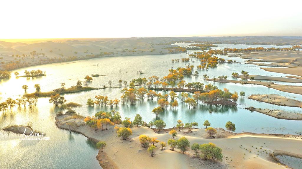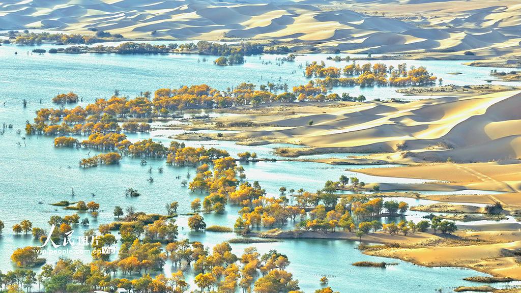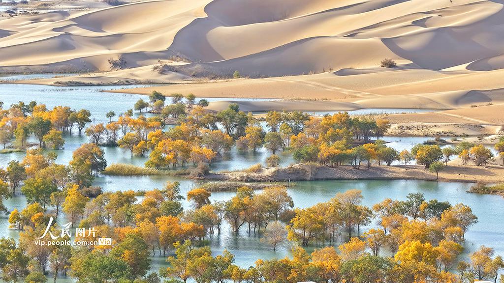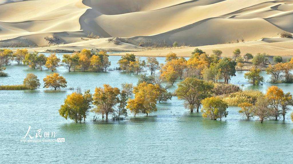 2025年10月6日,新疆巴音郭楞蒙古自治州尉犁县葫芦岛景区,泛黄的胡杨林与碧水沙丘共同构成了一幅秋日画卷。柴更利摄(人民图片网)
