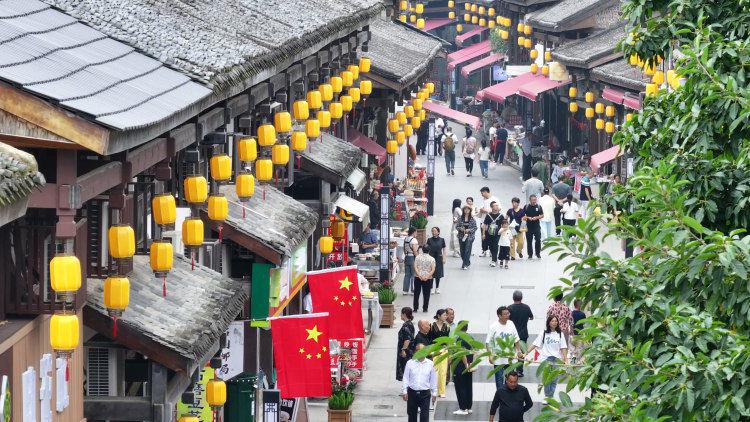 作为曾经游览大足石刻的必经之路,修建于明末清初的宝顶老街在今年国庆假期,经过升级改造后重新焕发活力,在千年石刻的文化底蕴之外,为游客增添了一抹浓郁的烟火气息。