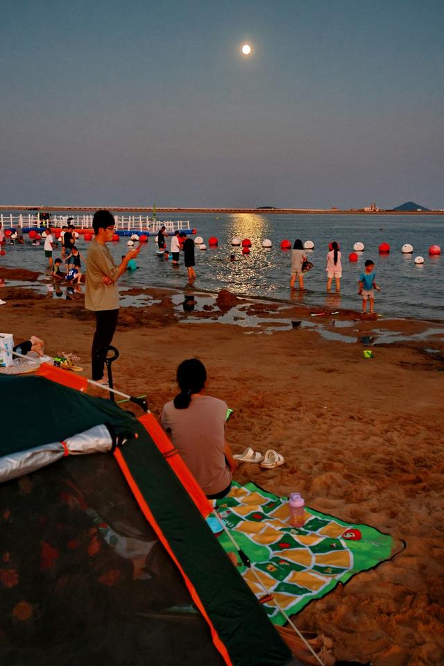 昨晚中秋夜,天气晴好。在金山城市沙滩,一轮明月从杭州湾上空升起,市民游客在这个明月之夜,用各种形式尽情观赏,留下美好回忆。