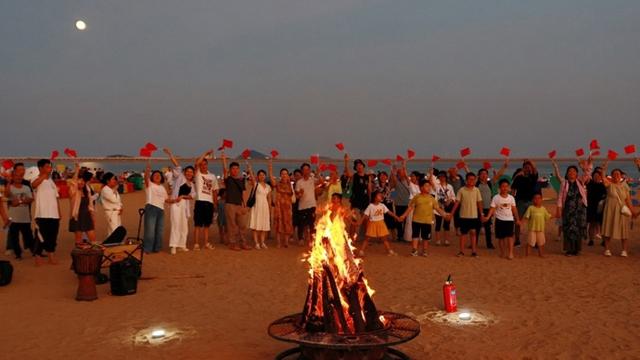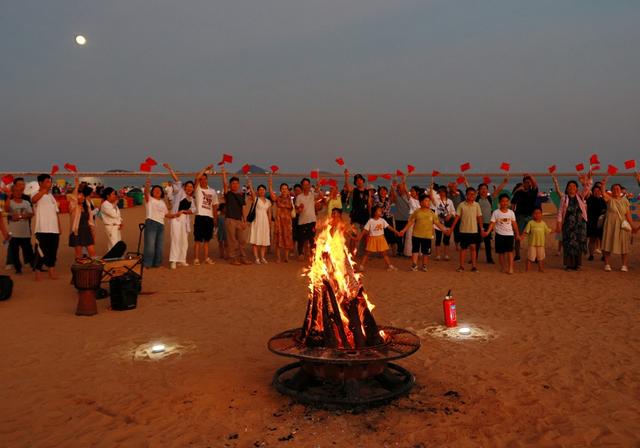 入夜,在金山城市沙滩,市民游客以篝火晚会形式,欢度中秋。