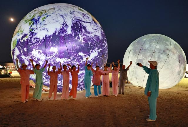 入夜,在金山城市沙滩,市民游客在巨大的“地球”、“月亮”前,欢度中秋。