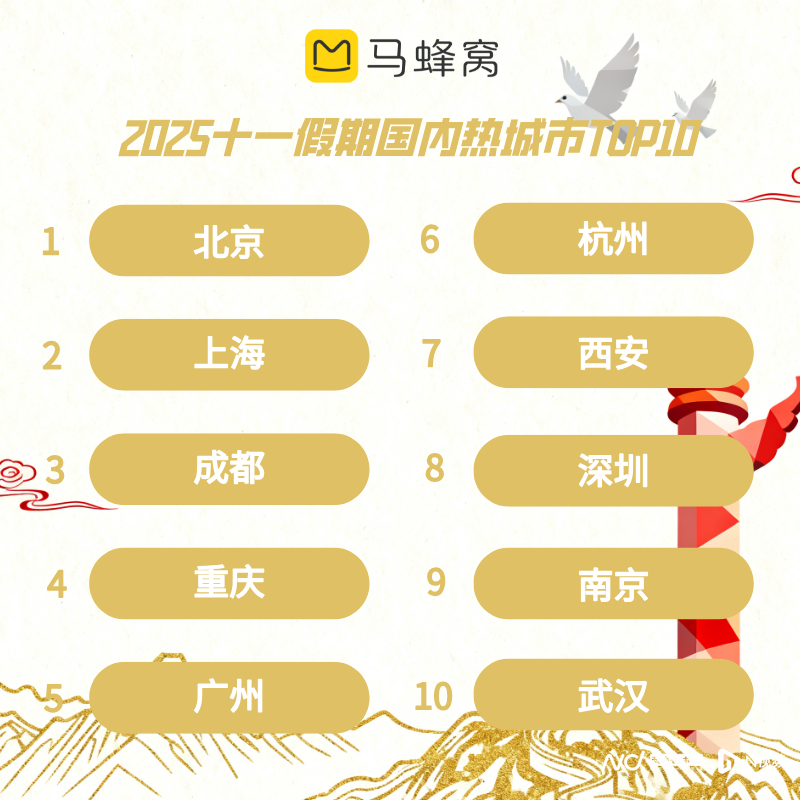 北京、上海、成都、重庆、广州、杭州、西安、深圳、南京、武汉上榜“十一”假期国内热门城市目的地前十。本就热度居高不下的北京,在世界乒乓球职业大联盟(WTT)中国大满贯赛、中国网球公开赛等体育赛事,以及《清明上河图》等国宝亮相的故宫百年大展加持下,热度再攀新高,是文体爱好者们当之无愧的假期首选,WTT举办地首钢园热度环比上涨460%。