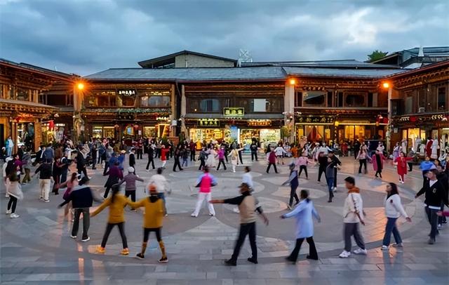 游客和当地群众在独克宗古城里一起跳舞 王静颐 摄