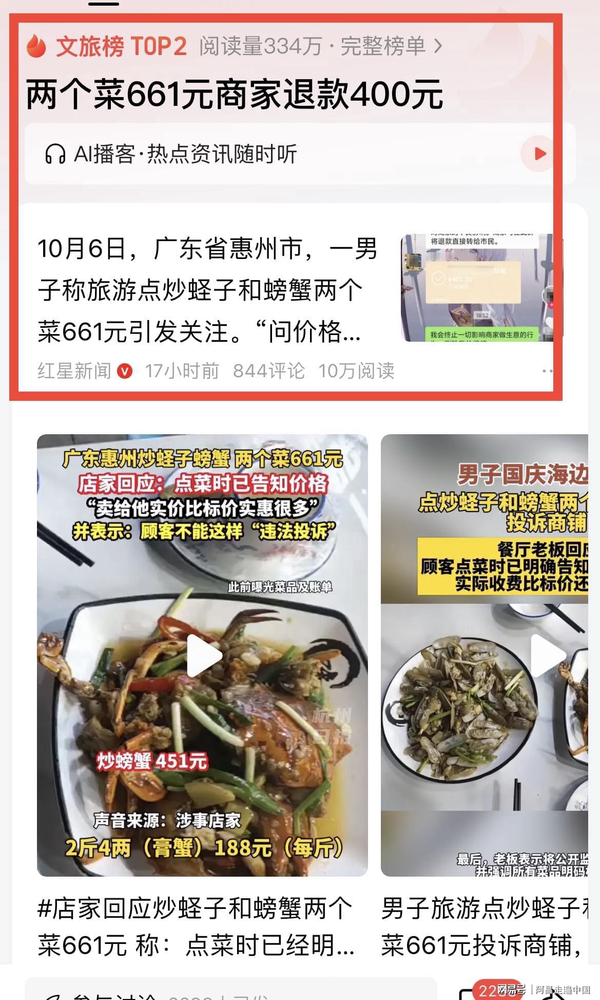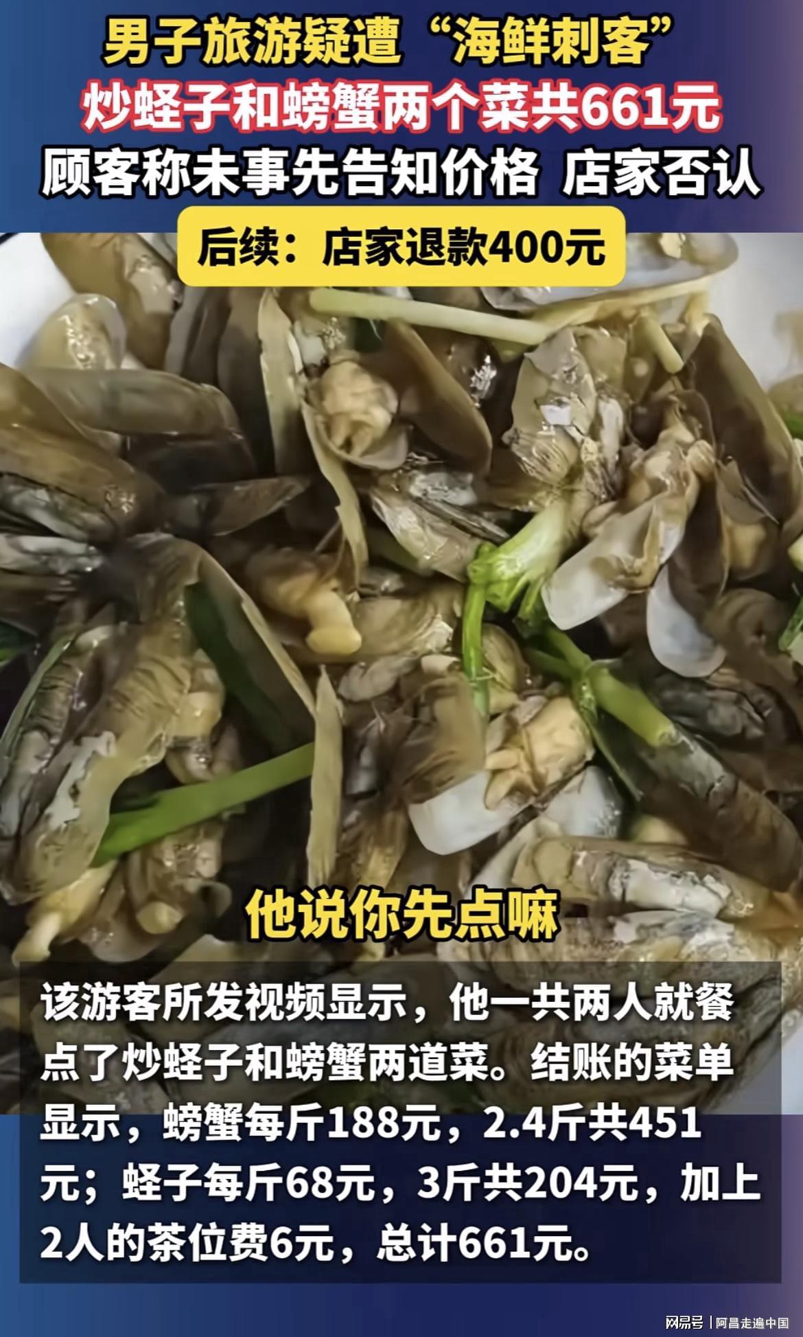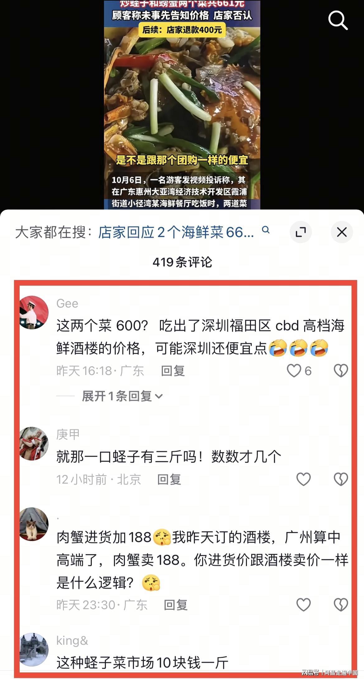 事发10月16日,游客到广东惠州大亚湾经济技术开发区霞浦街道小径湾一家海鲜餐厅吃饭点了一盘炒盘螃蟹和一盘蛏子,共消费661元,游客质疑商家宰客,游客把视频发到网上之后引发争议。