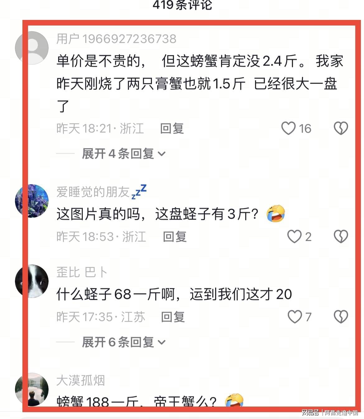 网友评价: 单价是不贵的, 但这螃蟹肯定没2.4斤。 我家昨天刚烧了两只膏蟹也就1.5斤 已经很大一盘了。