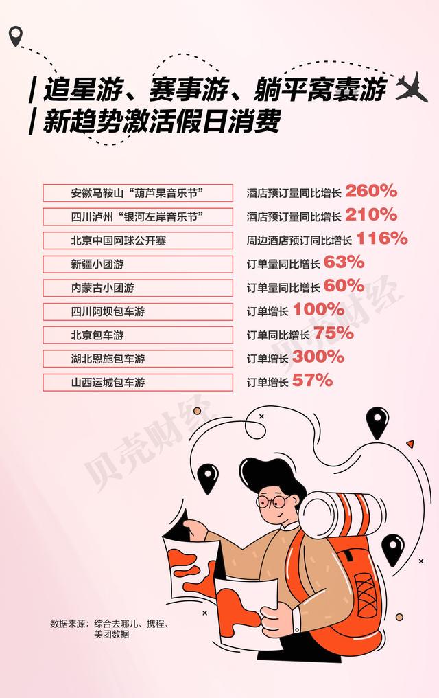 不过,“反向旅游”也出现了新的热度分化:有人成功探索到真正冷门的宝藏景点,也有人不约而同地涌向人气“黑马”目的地,例如假期订单量同比增长60%的景德镇,以及登顶全国县域酒店预订量榜首的九寨沟县。此外,相比于往年常见的“特种兵式”旅游,这届年轻人开启了省心省力的跟团游、包车游等躺平玩法,加上近年兴起的追星游、赛事游,共同推动多地旅游消费呈现强劲增长。