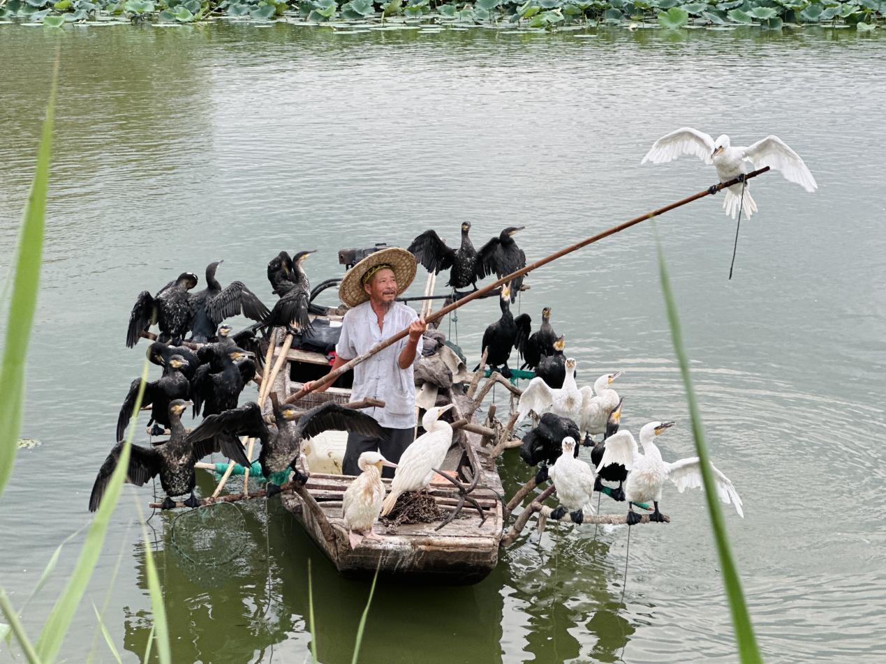 荷园内,竹篙轻点,鱼鹰振翅。第七代放鹰人吕高艳立于船头,一声哨响,相伴多年的“老伙计”便潜入水中,旋即叼起肥鱼,古老的捕鱼场景化为充满张力的艺术表演。他从“湖上把式”转型为景区表演者,不仅留住了技艺,更成为微山湖文旅舞台上的一道活态风景。