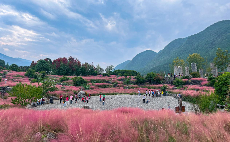 泰国游客们随后抵达的是叠石花谷,正值粉黛花海盛放的季节,成片的粉黛乱子草如云雾般铺满大地,营造出浪漫梦幻的氛围。他们纷纷走进花海,或漫步其间,或与花海合影,尽情享受这份独特的自然之美。不少游客拿出手机拍摄短视频,向远方的亲友分享眼前的美景,现场欢声笑语不断,旅程反响热烈。
