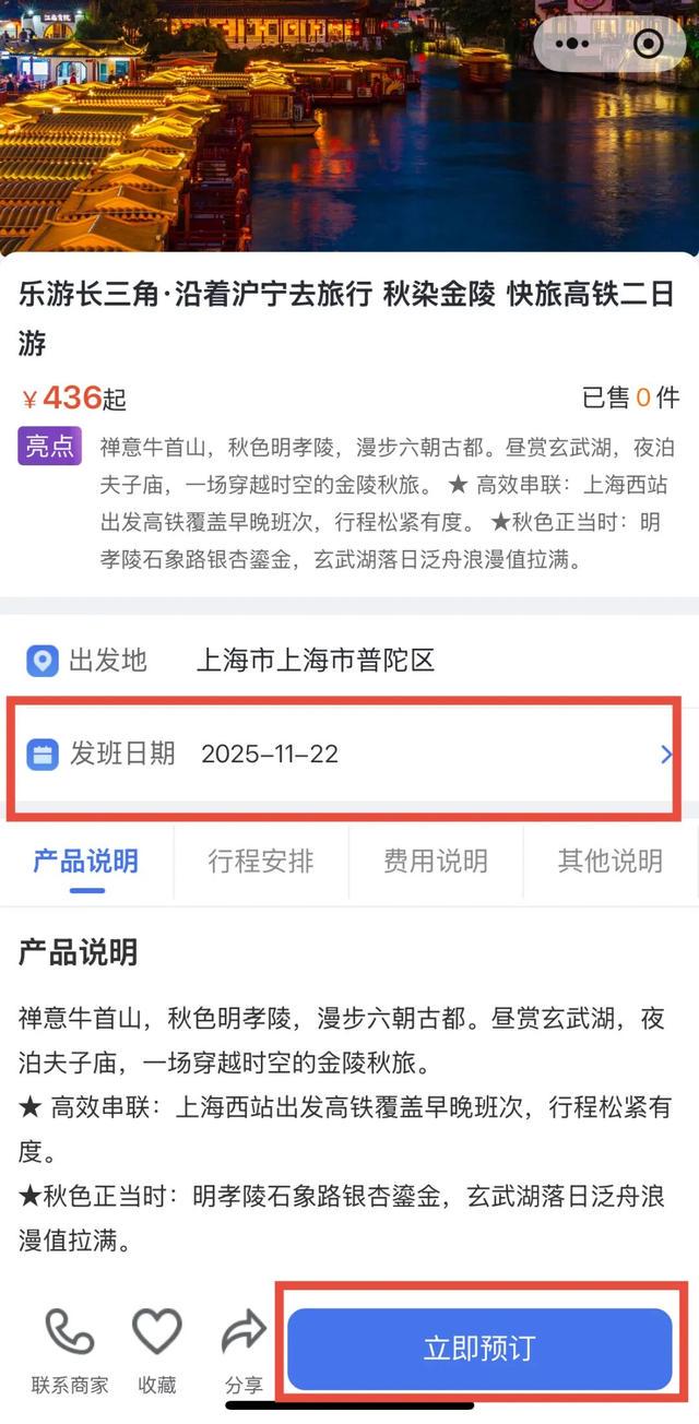 步骤五:选择心仪的旅游产品,确定发班日期后点击“立即预订”。