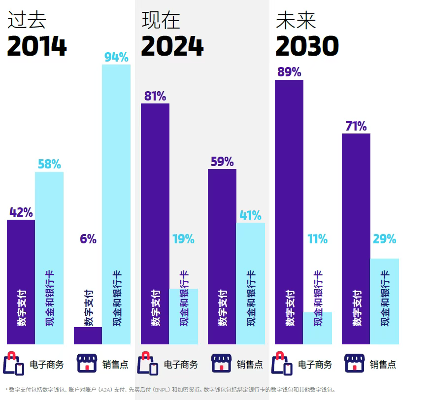 GPR报告显示,2014年,数字支付占电子商务交易额的42%,占销售点交易额的6%,到2024年,这两项比例分别飙升至81%和59%,预测到2030年,还将进一步提高至89%、71%。其中,中国市场凭借成熟的数字支付生态,为这一增长贡献了重要力量。