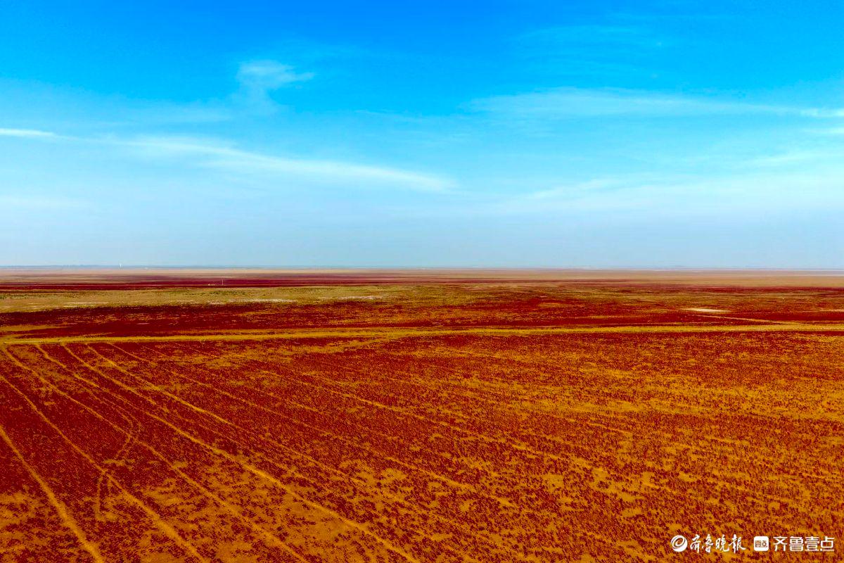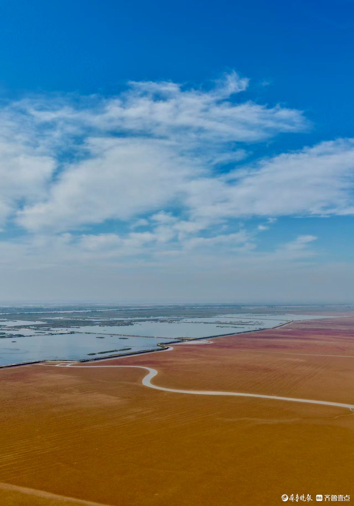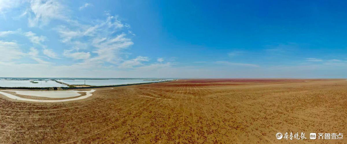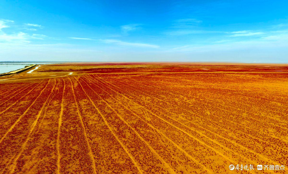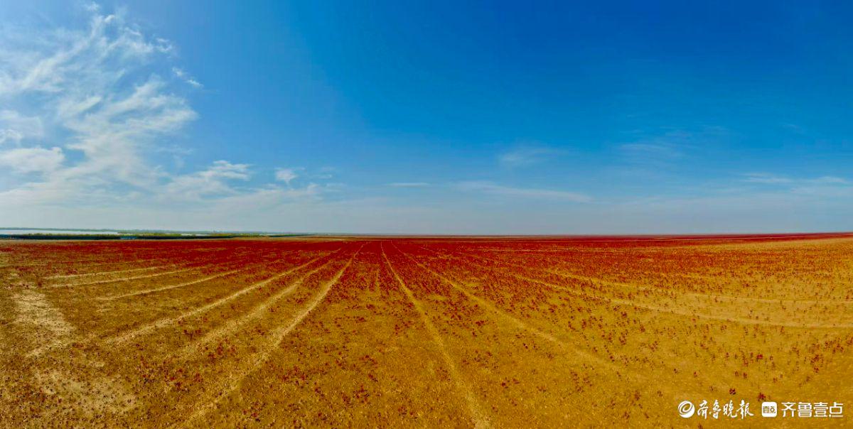 黄河三角洲位于东营市和滨州市境内,是黄河入海口处形成的冲积平原,是典型的河流三角洲地貌。红滩是黄河口湿地独有的自然景观,每年秋季成为观景热点。红滩,又叫红地毯,主要由一种叫黄须菜(又称碱蓬)的植物组成。这种植物能适应高盐碱度的土壤环境,连片生长后呈现出鲜艳的红色,尤其是在碱度较高的土壤中颜色更为浓烈。