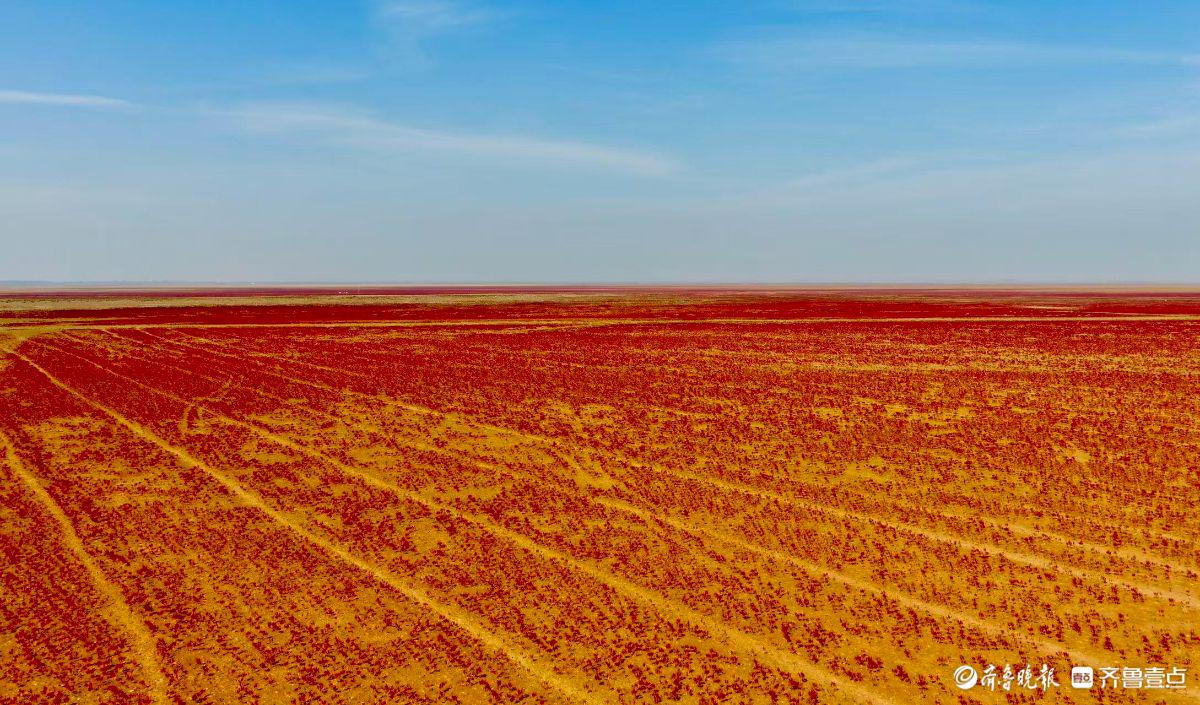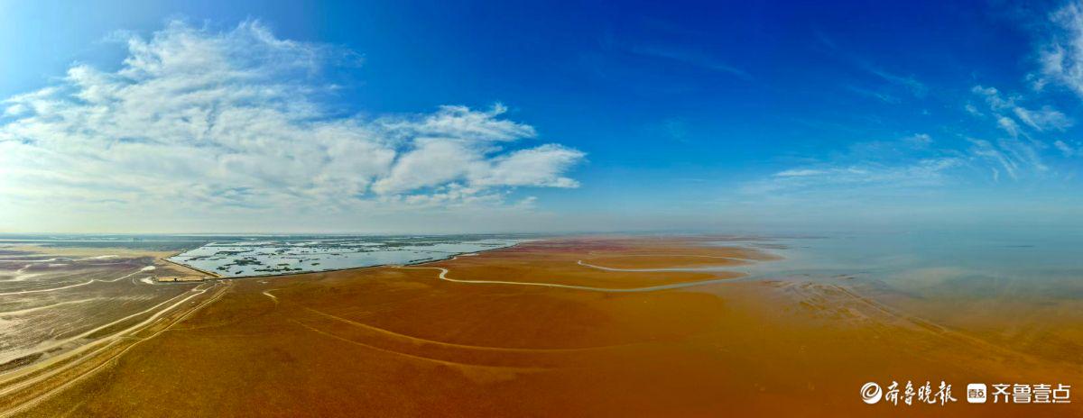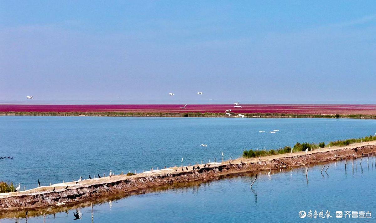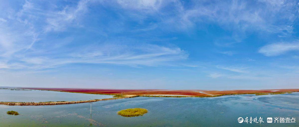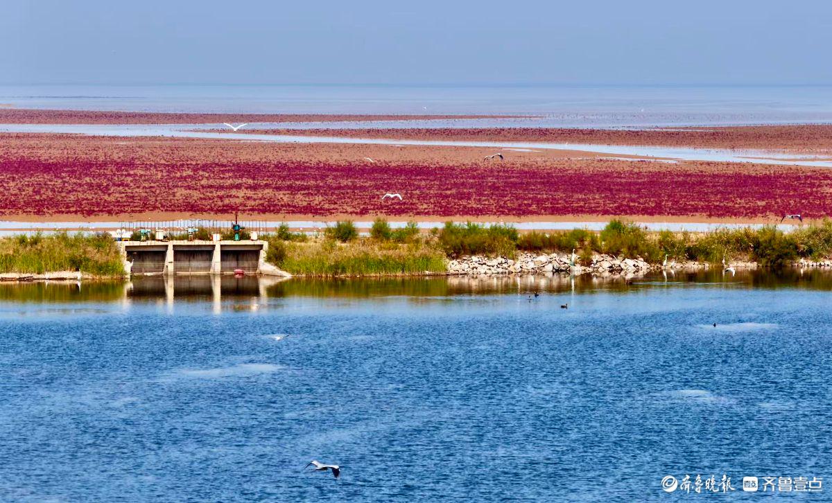 黄河三角洲位于东营市和滨州市境内,是黄河入海口处形成的冲积平原,是典型的河流三角洲地貌。红滩是黄河口湿地独有的自然景观,每年秋季成为观景热点。红滩,又叫红地毯,主要由一种叫黄须菜(又称碱蓬)的植物组成。这种植物能适应高盐碱度的土壤环境,连片生长后呈现出鲜艳的红色,尤其是在碱度较高的土壤中颜色更为浓烈。