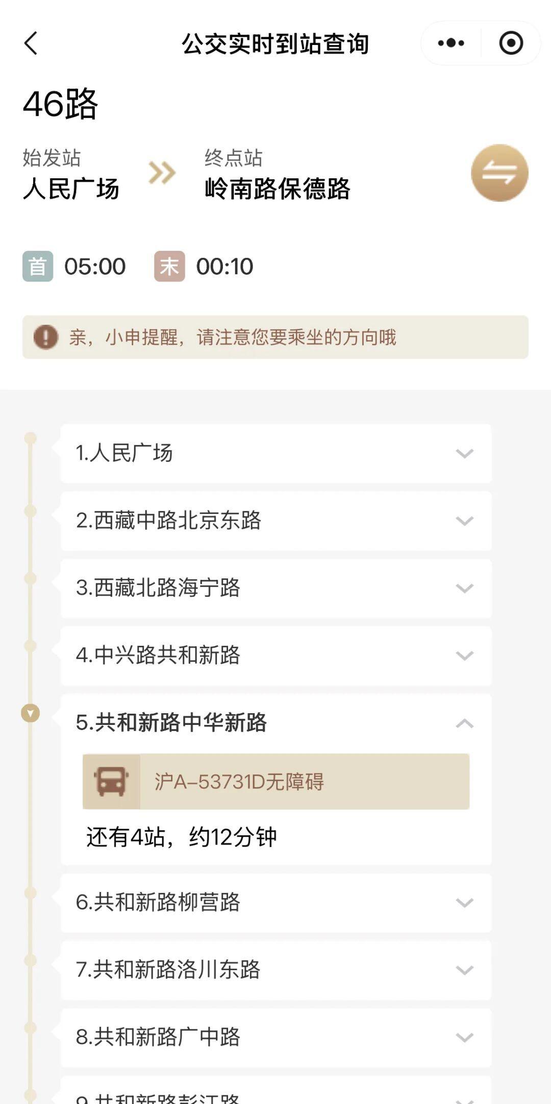 在这里,可以根据自身的需求搜索公交车名称。跳转至该公交车信息后,点击想要前往的公交站,即可查看公交车预计到达的时间,了解还有几分钟能够到达。