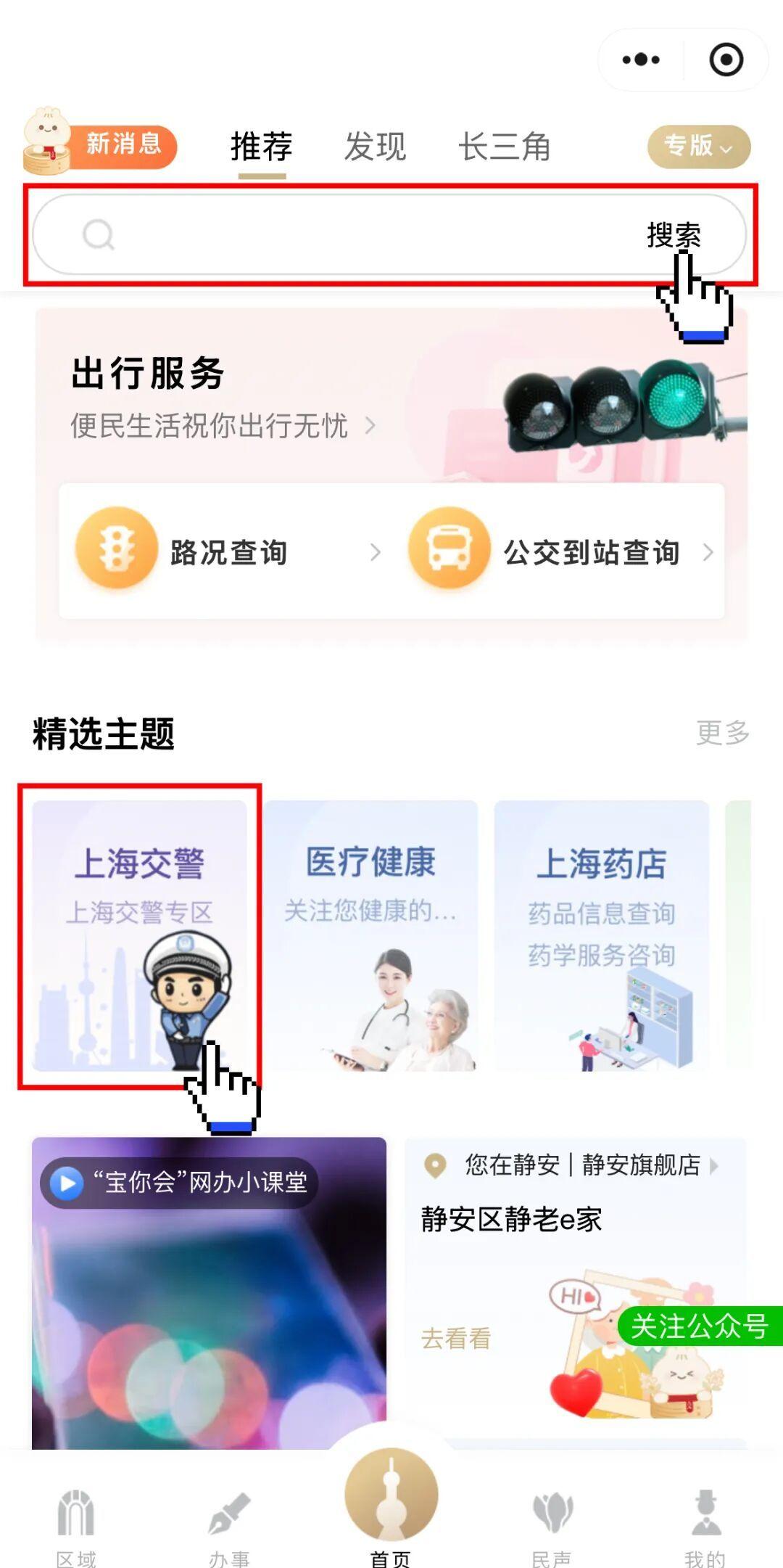 打开“随申办市民云”(app/微信小程序/支付宝小程序),首页搜索或下滑选择“上海交警”进入服务专区,在沪出行随时“响应”~