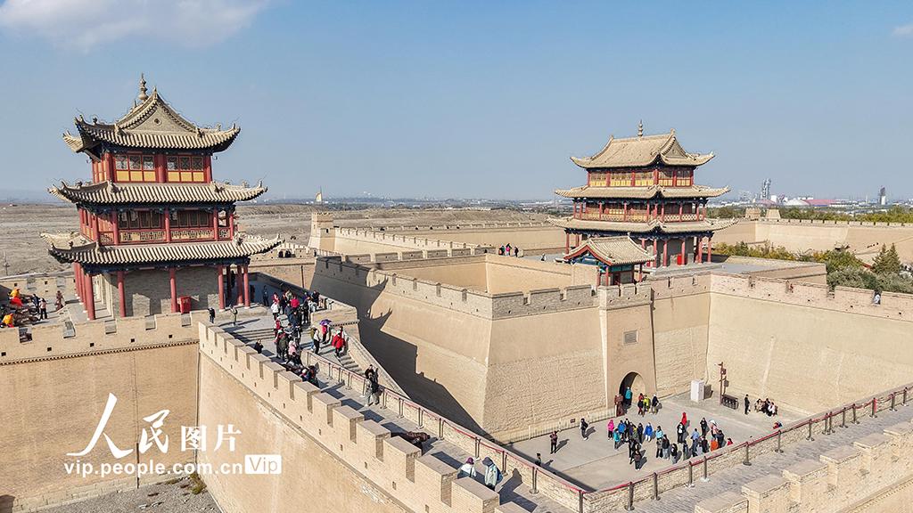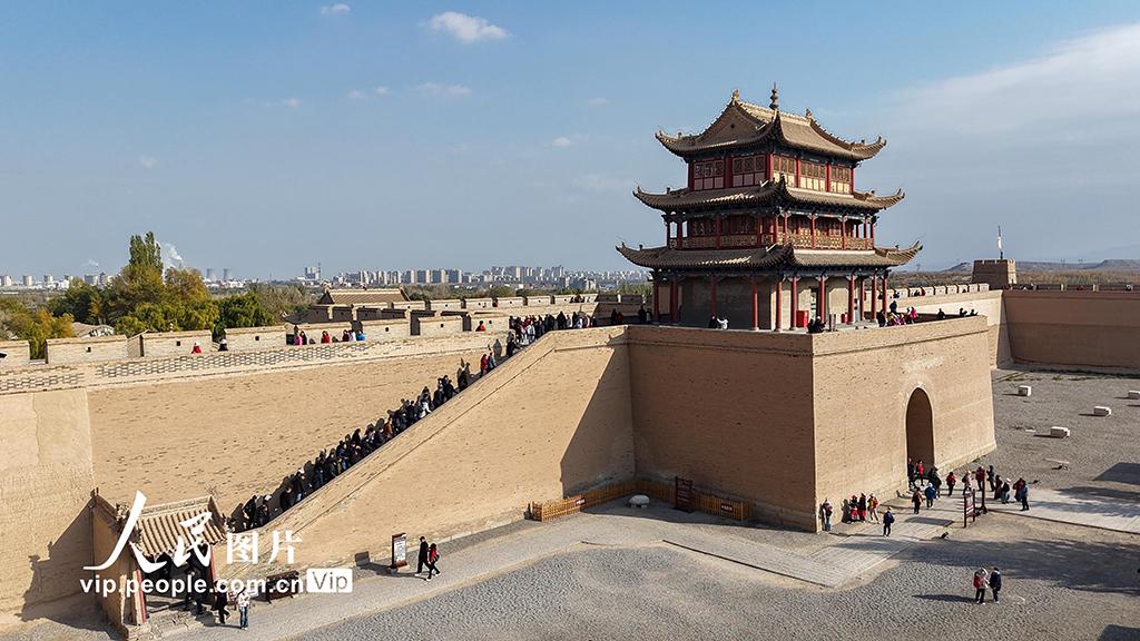 2025年10月16日,甘肃省嘉峪关市关城景区,游客登上城楼领略大漠雄关的壮阔美景。陈坤摄(人民图片网)