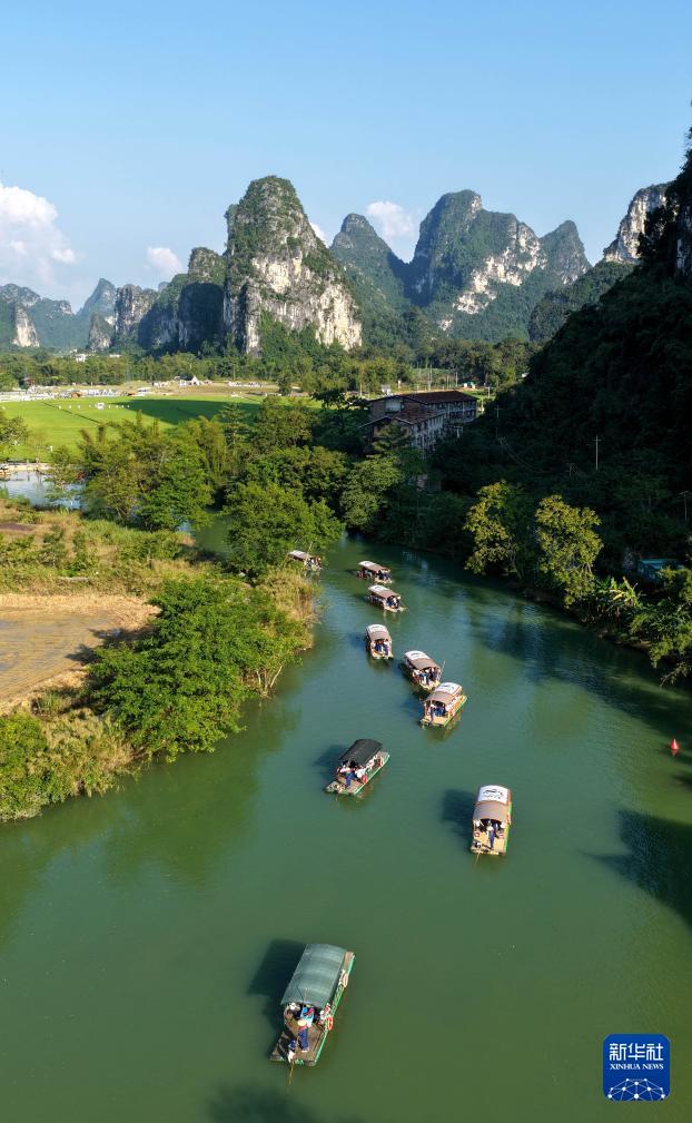 10月18日,在广西崇左市大新县堪圩乡明仕旅游度假区,游客乘坐竹筏在稻田边的明仕河上游玩。