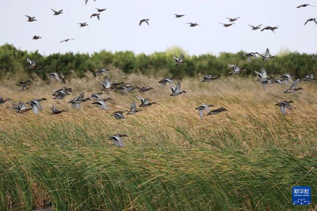 10月18日,在山东黄河三角洲国家级自然保护区湿地,候鸟展翅飞翔。
