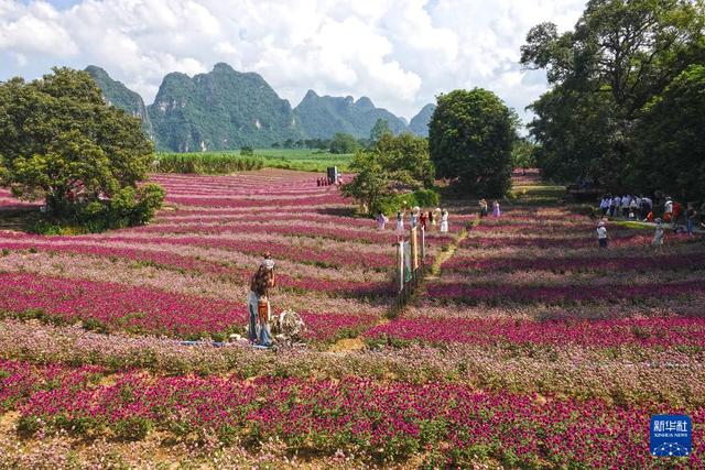 10月18日,游人在广西大新县峒那屿湾景区千日红花田赏花游玩。