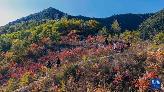 10月19日,游客在河北省遵化市南山常乐谷景区赏景游玩(无人机照片)。