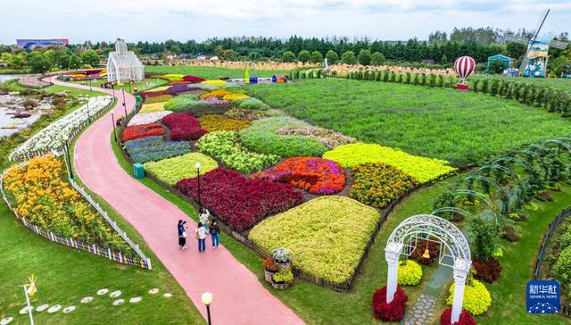 10月19日,游客在江苏省盐城市大丰区荷兰花海景区内赏花游玩(无人机照片)。
