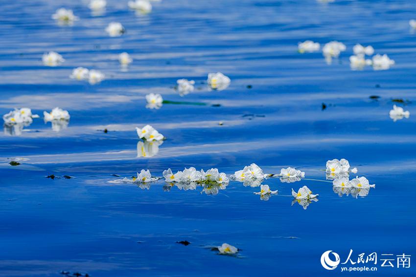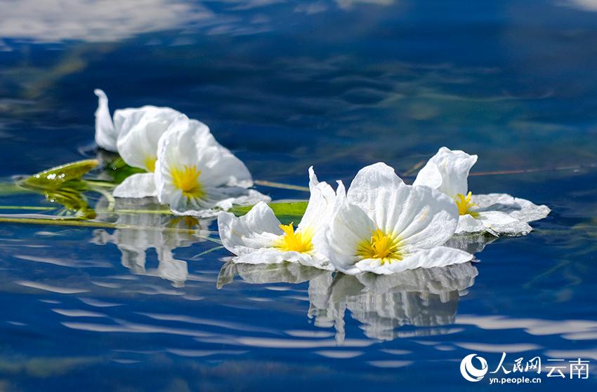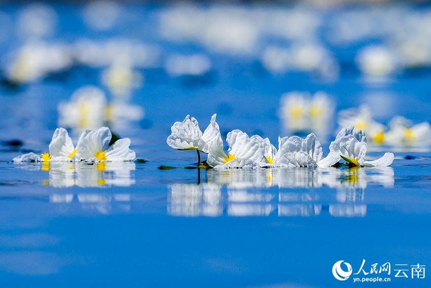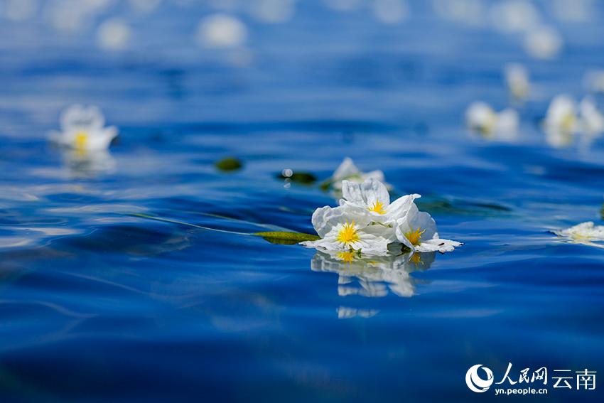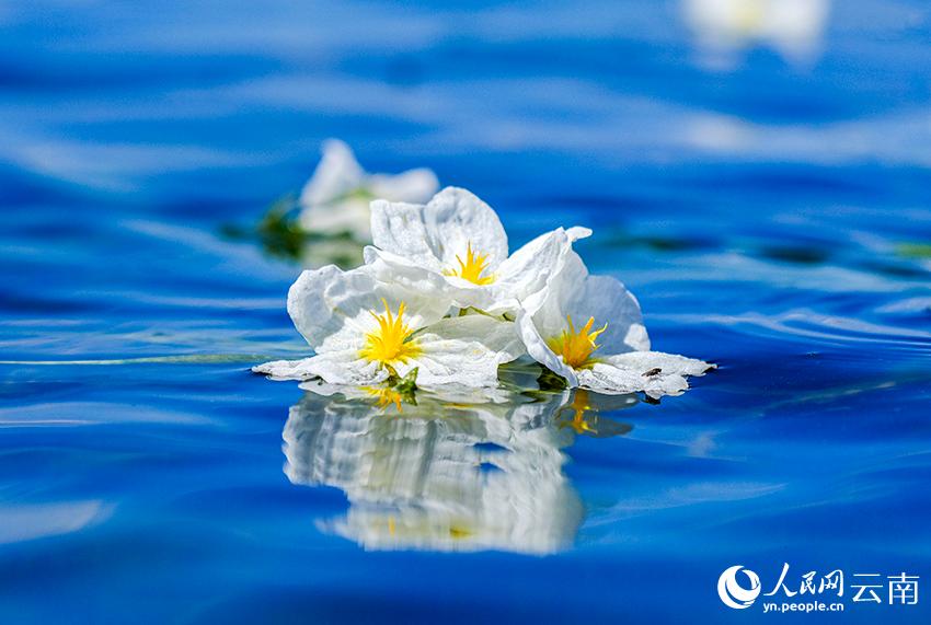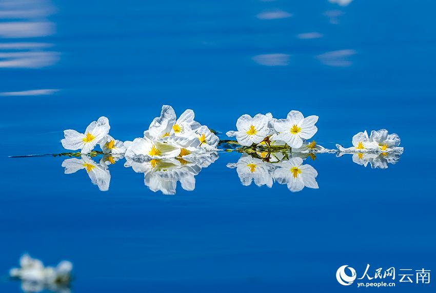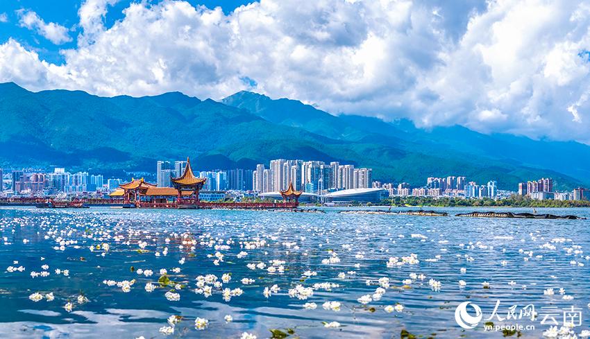 人民网大理10月20日电 (记者符皓)金秋十月,云南大理洱海清波荡漾,赶上好天气,蓝天白云倒映在洱海里,被称为“水质试金石”的海菜花在湖面绽放。白色的花朵和蓝色的湖面相映成趣,蓝白之间尽显洱海生态之美。