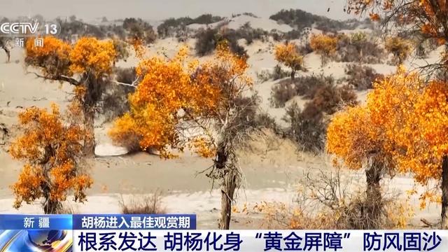 胡杨,被称为“沙漠英雄树”。它们耐旱、耐盐碱、抗风沙,发达的根系深扎地下数十米,既能锁住沙丘,又能涵养水源、调节气候。我国胡杨林面积约占全球的61%,大部分分布在新疆塔里木河流域。眼下,新疆各地胡杨进入最佳观赏季。