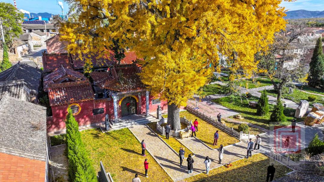 在高平市三甲镇三甲南村的关帝庙前,一株千年银杏母树正迎来最佳观赏期。