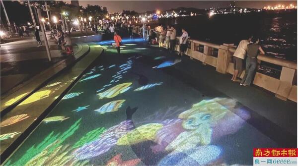 如今,漫步在公园的小径上,游人仿佛置身于一场梦幻的海底探险。娇俏可爱的美人鱼、色彩斑斓的热带鱼、轻盈飘动的水草、波光粼粼的海浪……氛围灯营造出了一个丰富多彩的海底世界。孩子们兴奋地指着那些灯光造型,欢呼雀跃,大人们也被这迷人的景致所吸引,纷纷拿出手机记录下这美好的瞬间。灯光与成片绿化相互映衬,新栽的绿植树影婆娑,让整个公园充满了生机与活力。公园与不远处的夜市相互串联,各种小吃摊、手工艺品店灯火通明,烟火气与海的气息交融在一起,形成了一幅热闹又不失雅致的夜间生活画卷。