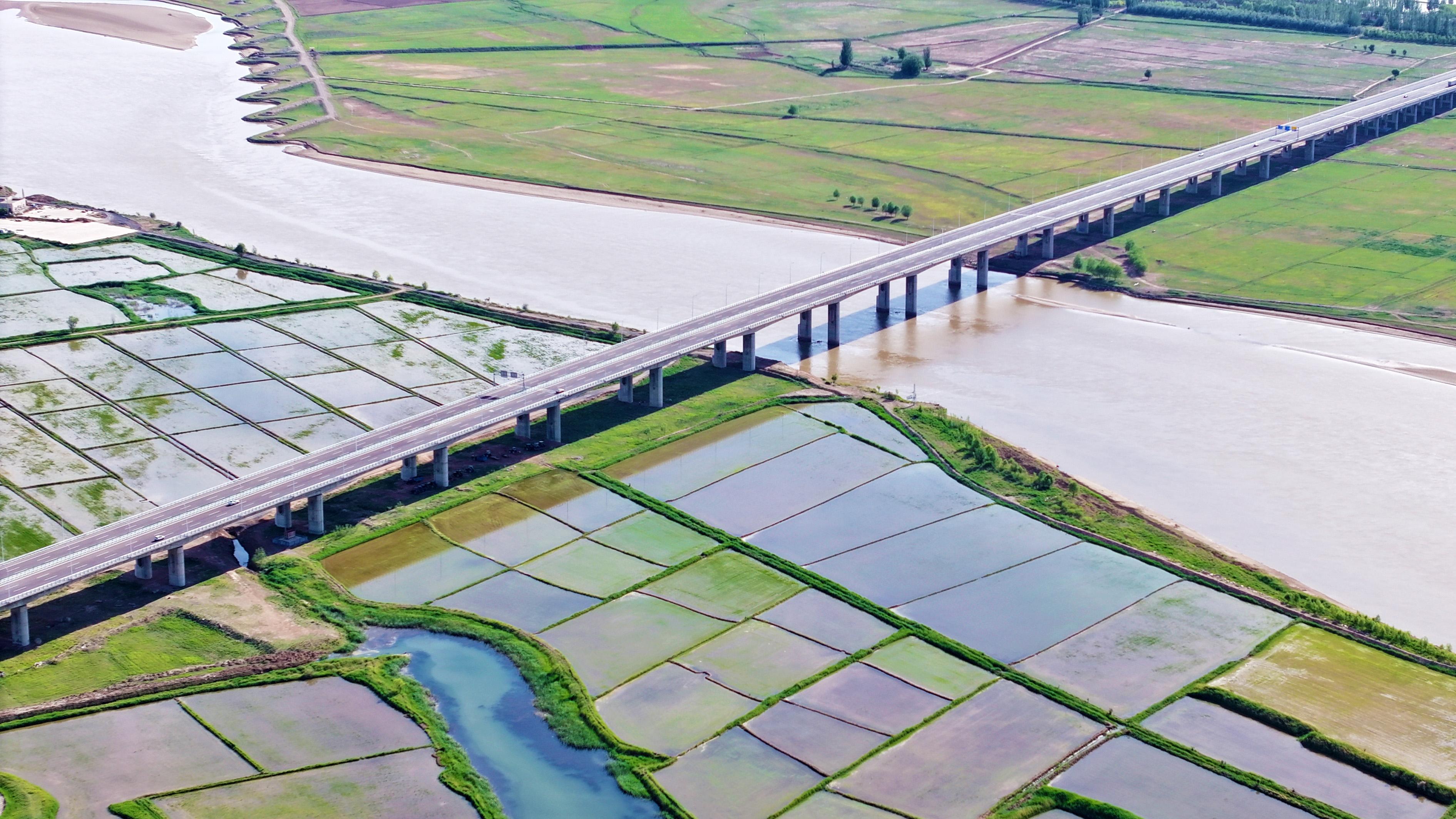 2025年6月3日,俯瞰位于宁夏银川市兴庆区月牙湖乡的黄河银川段,奔流不息的黄河与两岸稻田、和美村庄构成了一幅生态美景。