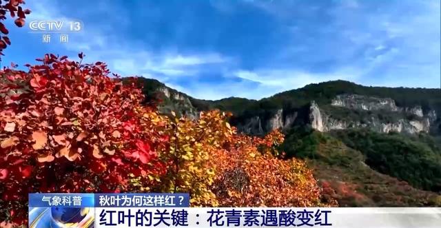 红叶的关键是花青素遇酸变红。秋季温差大的天气,特别利于花青素的合成。像枫树、黄栌这类树木,叶子细胞里的汁液是酸性的,花青素在酸性环境下会呈现红色,它们便会在秋天由绿变红。