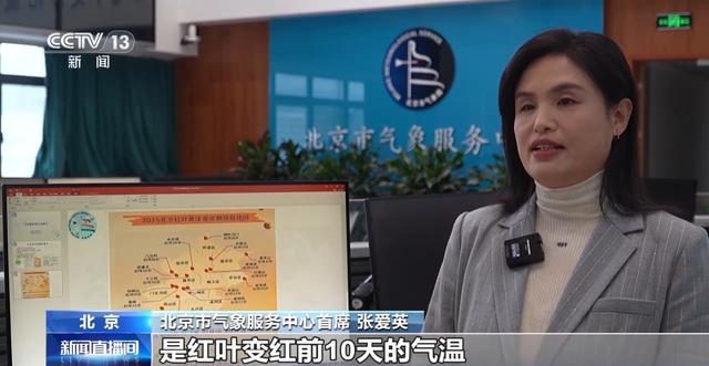 北京市气象服务中心首席 张爱英:最关键的影响因子,是红叶变红前10天的气温,尤其是昼夜温差起到最直接的作用。根据最佳观赏期预报,今年以黄栌为代表的最佳观赏期与常年基本持平,北京城区大部分景点于10月24日左右进入最佳观赏期,高海拔山区目前已经进入最佳观赏期。