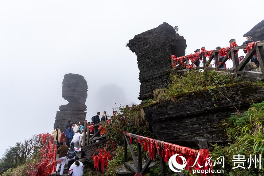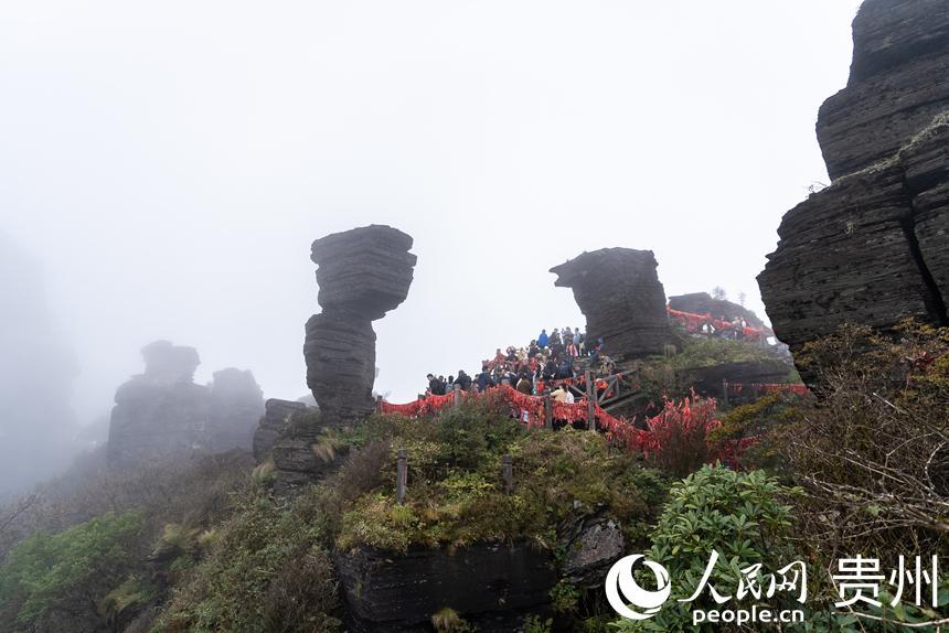 游客在梵净山景区标志性景点“蘑菇石”处打卡拍照。人民网记者 涂敏摄